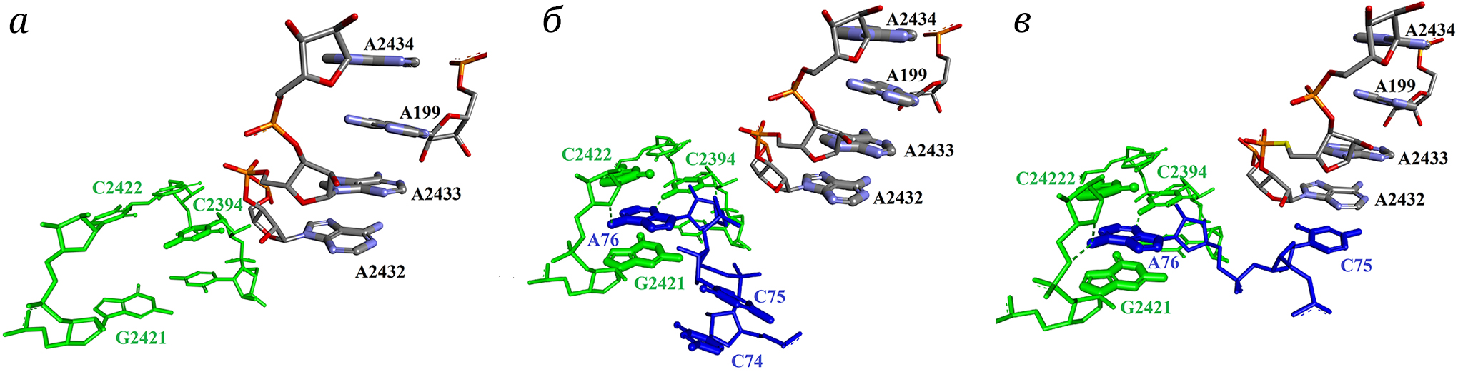 Рис. 5. NA-BSE, образующиеся при связывания 3′-конца деацилированной тРНК с E-сайтом рибосомы E. coli. а – «Карман» для связывания акцепторного конца тРНК в вакантной рибосоме (PDB ID: 6PJ6); б – NA-BSE G2421–A76–C2422, деацилированная тРНК находится в рибосоме в промежуточном P/E-состоянии (PDB ID: 8SYL); в – образование плоской конформации С75–А76 и стопкообразного NA-BSE с участием остатка С75 тРНК перед диссоциацией тРНК из рибосомы (PDB ID: 7K00)