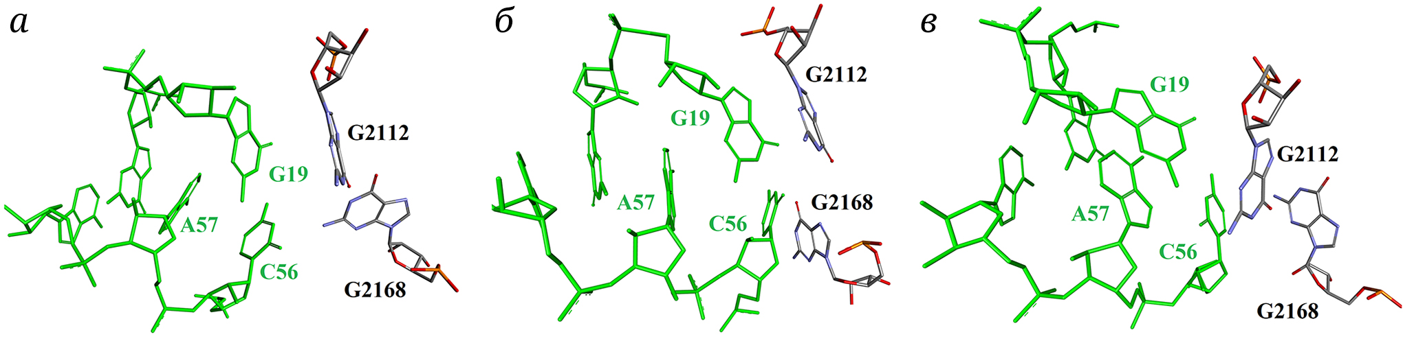 Рис. 6. Относительное расположение остатков G19 и C56 «локтя» тРНК и G2112 и G2168 «L1-выступа» 23S рРНК, а – на начальном этапе перемещения тРНК из Р-сайта в Е-сайт рибосомы (PDB ID: 7ST6); б – при полном перемещении тРНК в Е-сайт (PDB ID: 7SSN); в – на начальном этапе диссоциации тРНК из Е-сайта (PDB ID: 7ST2)