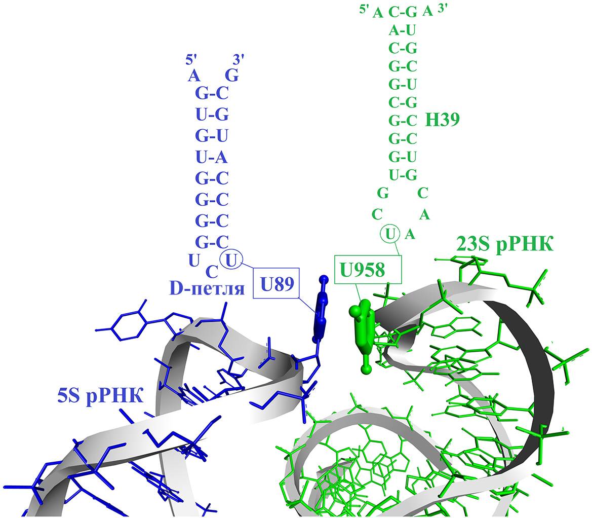 Наличие непосредственного контакта двух остатков уридиловой кислоты, показанных на рис. 8, хорошо согласуется с полученными ранее экспериментальными данными. Во-первых, рассматриваемые здесь одноцепочечные участки двух разных рРНК в рибосоме E. coli могут быть ковалентно связаны реагентами, избирательно сшивающими основания рядом расположенных н.о. РНК [33]. Во-вторых, мутации в «петле 960» 23S рРНК приводят к изменению реакционной способности соседнего с U89 остатка С90 D-петли 5S рРНК [34].