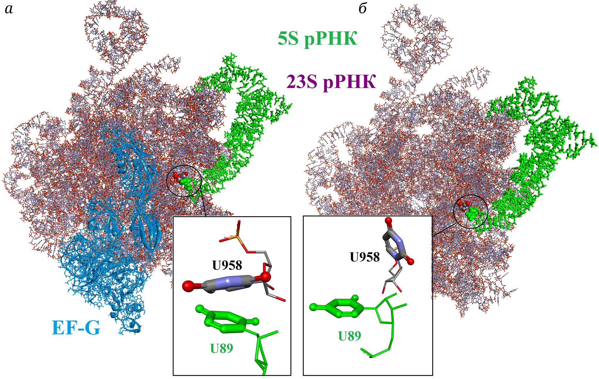 Рис. 8. Взаимное расположение нуклеотидных остатков U89 тРНК и U958 23S рРНК, а – в присутствии (PDB ID: 7SSL) и б – в отсутствии (PDB ID: 7SSW) элонгационного фактора EF-G в рибосоме E. coli