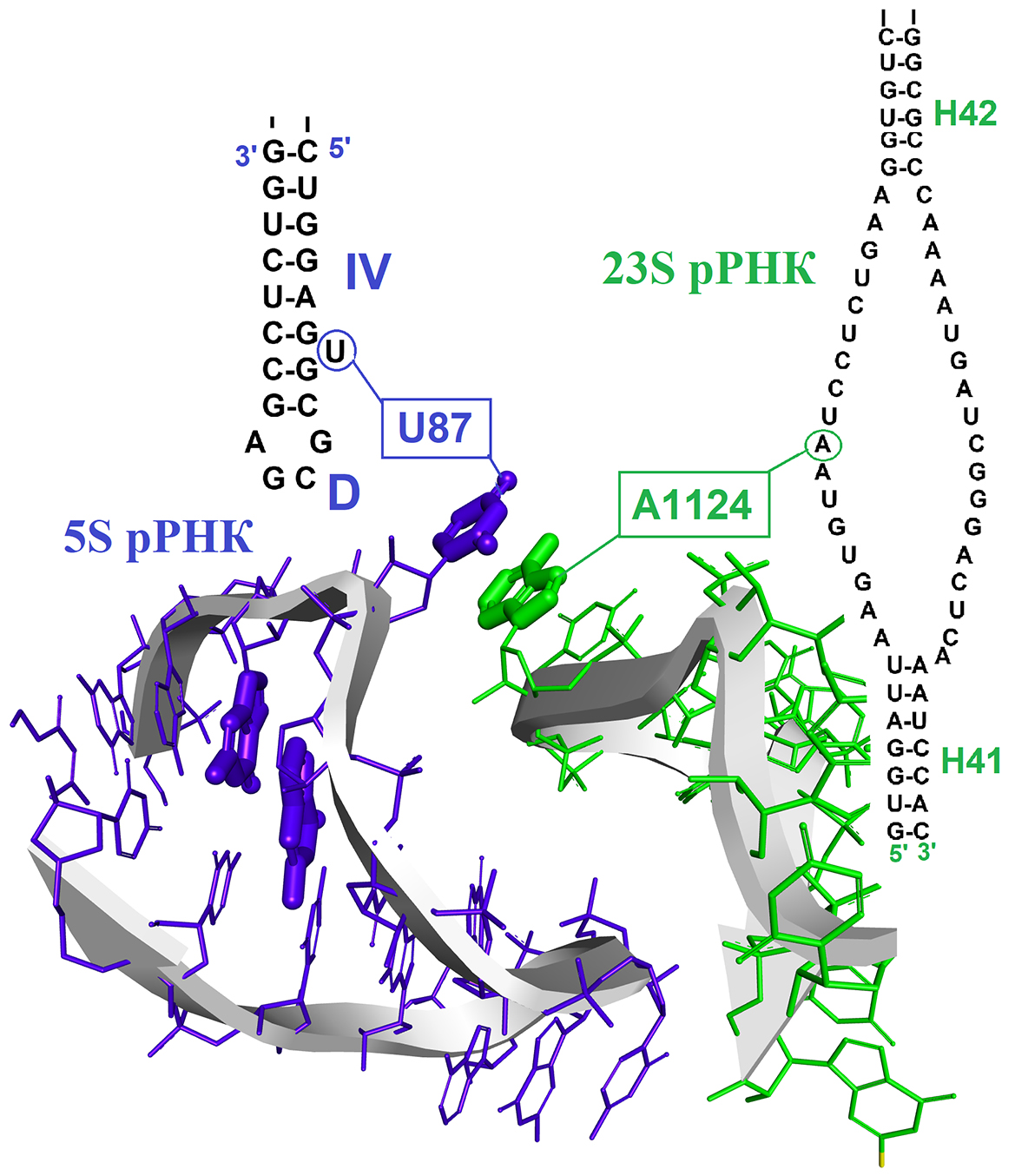 Рис. 7. NA-BSE, образованный нуклеотидными остатками D-петли 5S рРНК и т.н. «петли 960», замыкающей спираль H39 23S рРНК в рибосоме E. coli (PDB ID: 5MDV)