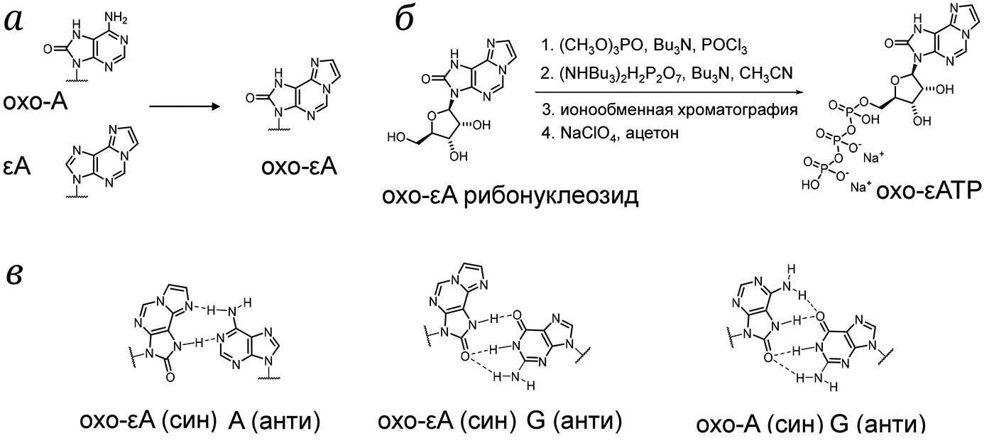 Рис. 1. Структура oxo-εA-модификации (а), химический синтез oxo-εATP (б) и предполагаемые пары oxo-εA:A, oxo-εA:G и oxo-A:G (в)