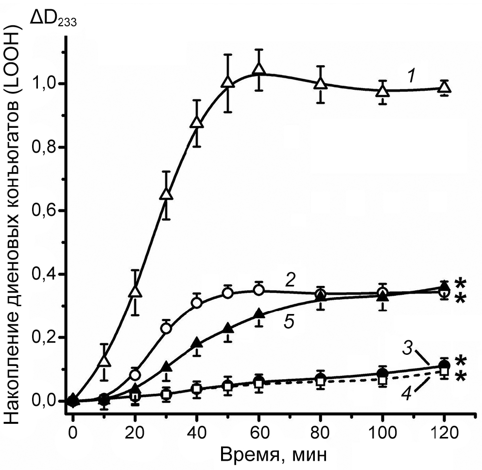 Рис. 3. Влияние различных липофильных антиоксидантов на кинетику накопления LOOH (диеновых конъюгатов) в процессе Cu2+-инициированного СРО частиц ЛНП. 1 – Окисление нативных ЛНП без добавления антиоксидантов (контроль); 2 – ЛНП + 80 мкМ убихинола Q10; 3 – ЛНП + 80 мкМ α-токоферола; 4 – ЛНП + 80 мкМ убихинола Q10 + 80 мкМ α-токоферола; 5 – ЛНП + 80 мкМ skQ1. Статистически значимыми являются различия групп 2–5 по отношению к группе 1 (контроль); * p < 0,05