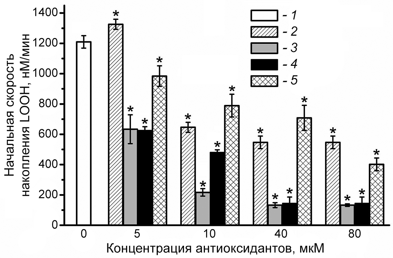 Рис. 5. Влияние различных концентраций экзогенных α-токоферола, убихинола Q10 и skQ1 на начальную скорость Cu2+-инициированного СРО липидов в частицах ЛНП; 1 – нативные ЛНП без добавления антиоксидантов (контроль); 2 – ЛНП + убихинол Q10; 3 – ЛНП + α-ТОН; 4 – ЛНП + α-ТОН + убихинол Q10 (антиоксиданты добавлялись в эквимолярных концентрациях); 5 – ЛНП + skQ1. * р < 0,05 – статистически значимые различия экспериментальных групп по отношению к контролю (начальная скорость накопления LOOH при отсутствии антиоксидантов)