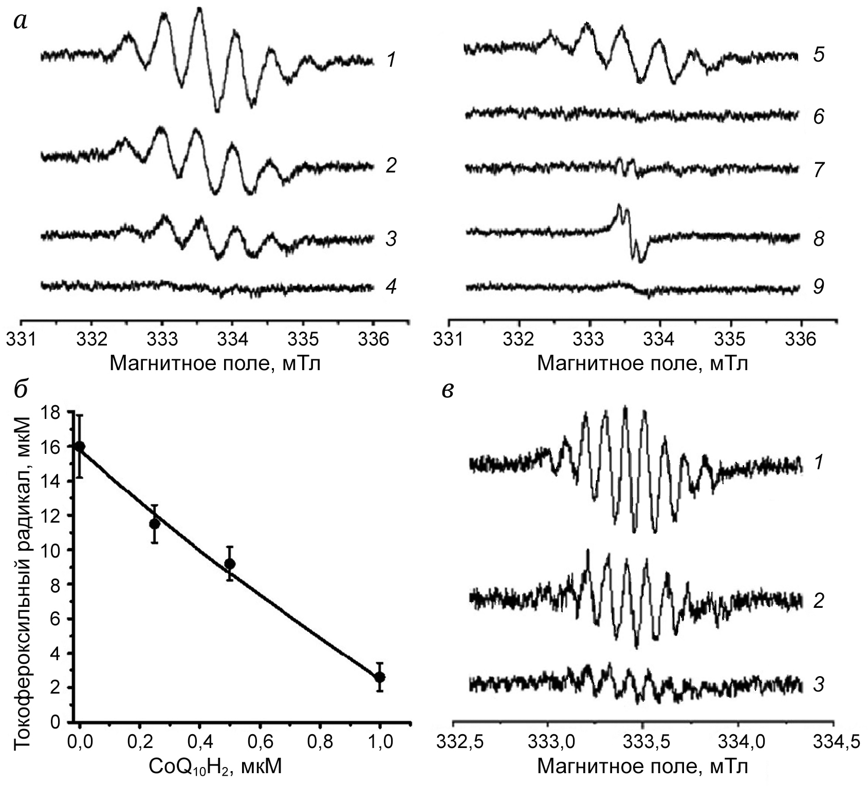 Рис. 7. Восстановление свободных радикалов α-токоферола (α-TO•) и пробукола. Спектры ЭПР свободных радикалов регистрировали в реакционной смеси, содержавшей 320 мМ α-ТОН или 160 мМ пробукола, которые были предварительно окислены MnO2. а – Среда с α-TO• без добавок (1); среда с α-TO• после внесения CoQ10H2 в концентрациях 0,25 (2), 0,5 (3) и 1 (4) мМ; среда с α-TO• после внесения 1 (5), 2 (6) и 5 (7) мМ аскорбата Na; среда, содержавшая феноксильный радикал пробукола (8); среда, содержавшая феноксильный радикал пробукола после внесения 0,5 мМ CoQ10H2 (9). б – Концентрационная зависимость восстановления α-TO• убихинолом Q10. в – Образование СoQ10H• в реакционной смеси при неполном восстановлении СoQ10 боргидридом натрия. Реакционная среда содержала 100 мкМ СoQ10 и 50 мкМ NaBH4. Спектры ЭПР записаны через 2 мин (1), 10 мин (2) и 30 мин (3) инкубации смеси