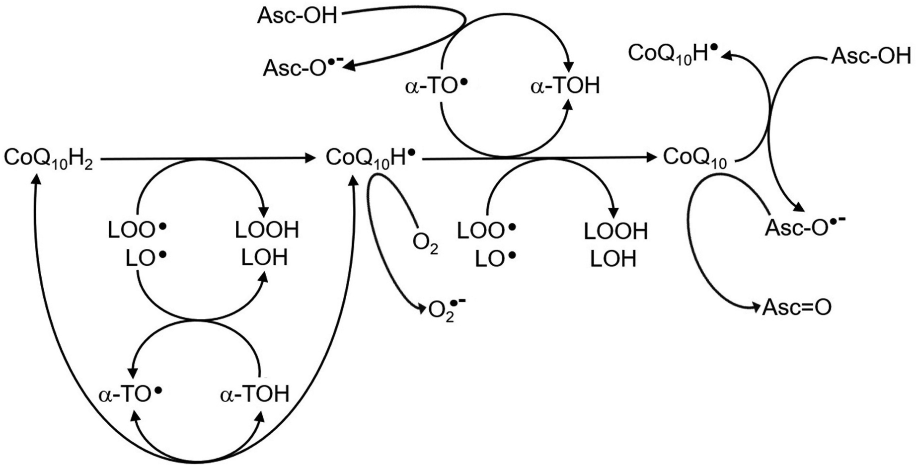 Рис. 8. Гипотетическая схема, иллюстрирующая возможные механизмы биорегенерации СoQ10H2 и α-ТОН в процессе СРО частиц ЛНП. Принятые обозначения: СoQ10H2, СoQ10H• и СoQ10 – убихинол Q10 (восстановленная форма коэнзима Q10), убисемихинол Q10 и убихинон Q10 (окисленная форма коэнзима Q10) соответственно; α-ТОН и α-ТО• – α-токоферол и токофероксильный радикал; Asc-OH, Asc-O• и Asc=O – аскорбиновая кислота, семидегидроаскорбат и дегидроаскорбат соответственно; LOO• и LO• – пероксильный и алкоксильный радикалы ПНЖК; LOOН и LOН – гидропероксид и гидроксид липидов