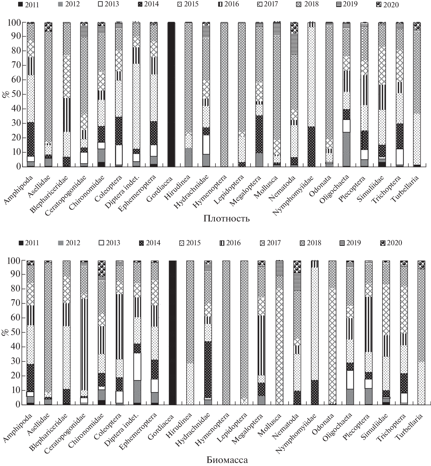 The results of long-term studies are used to present, for the first time, the structural organization of zoobenthos communities and the dynamics of their density and biomass in rivers and brooks of the the Khektsir Ridge, including the boundaries of the Bol’shekhekhtsirskii Reserve, Khektsirskii Wildlife Reserve (the southern part of the Russian Far East). The benthic organisms were found to contain 23 groups (22 groups in the spring and summer, 19 groups in the autumn, and 8 groups in the winter). Leading in the occurrence frequency (>90%) were chironomids, mayflies, and oligochaetes. The chironomids and amphipods accounted for 37.0 and 19.1% of the total benthos density, and mollusks and amphipods, for 32.1 and 29.7% of the total biomass, respectively. Dominants in terms of density and biomass were amphipods; chironomids dominated in terms of density, and mollusks, in terms of biomass. The mean density of benthic organisms was 637 ± 21 spec./m2, and the mean biomass was 1.8 ± 0.2 g/m2. The benthic communities of rift segments in the rithral zone were found to be most productive. It is shown that the seasonal and long-term dynamics of zoobenthos communities is pronounced and can be traced in the group composition, structure, and quantitative characteristics.