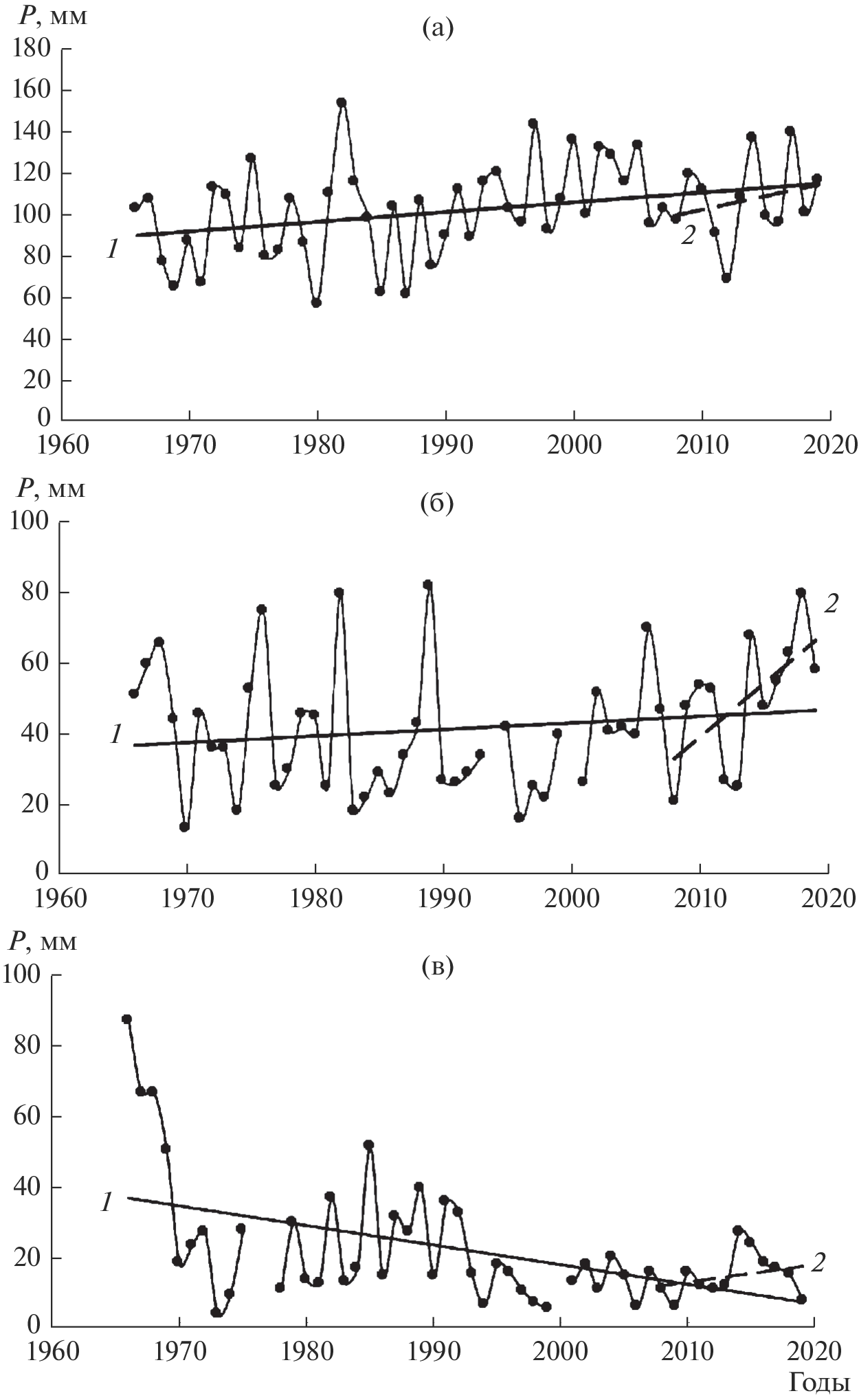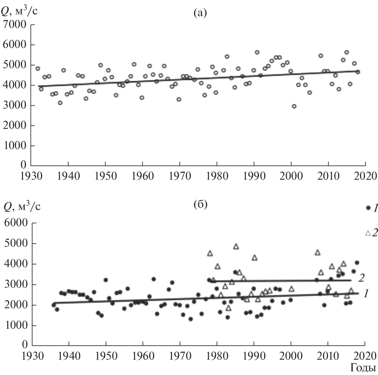 Long-term variations of water balance components are compared for the deltas of the Pechora and Koluma rivers, flowing in the occurrence area of discontinuous and continuous permafrost rocks. Trends in the variations in the major components of water balance equation (river water flow, precipitation, and losses or increment of runoff in the delta) are considered for the conditions of climate warming (the late XX–early XXI centuries). A distinct increase, most pronounced in 2008–2018, was recorded in the major components of water balance.