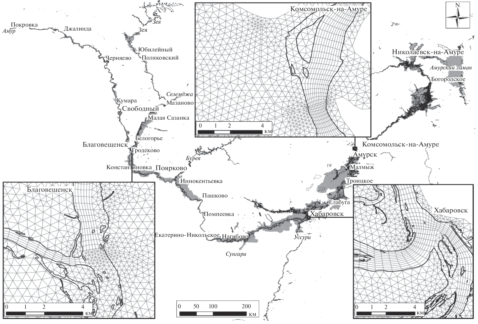 The article formulates the main requirements to numerical algorithms for hydrodynamic 2D-modeling of long and very long river segments with lengths of up to several thousand kilometers. The main feature is the use of adaptive unstructured mesh along with algorithms that give correct values of water surface elevations on coarse mesh, taking into account abrupt changes of bed elevations. A hydrodynamic model of a segment of the Amur R. with a total length of >3 thous. km is presented, which is based on a numerical solution of two-dimensional shallow-water equations (Saint-Venant) by a new high-accuracy algorithm, taking into account road and protection structures in the floodplain. The stages of model construction and verification are described, and the results of calculations for an extraordinary flood in 2013 and a high flood in 2020 are given. Water levels (with estimates of their errors) and the rates of water discharge at gages are given along with flow fields and the inundation zones of floodplain areas.