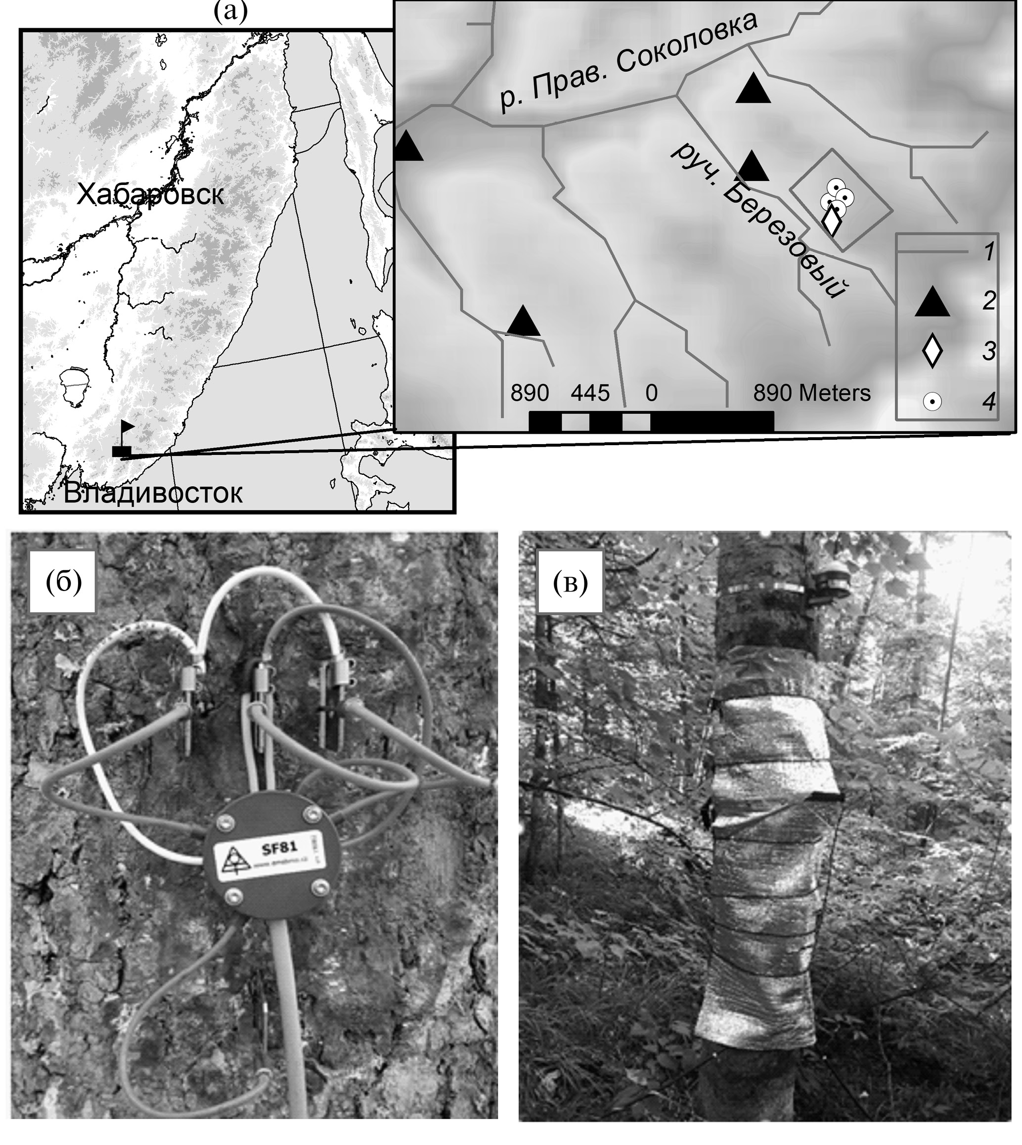 Рис. 1. Мониторинговая сеть водосбора руч. Березового: а – картосхема водосбора и размещение пунктов наблюдений; б ‒ установленные в стволе sapflow-датчики; в ‒ внешний вид измерительной системы. 1 – речная сеть, 2 – метеостанции, 3 – почвенный датчик, 4 – измеряемые деревья.