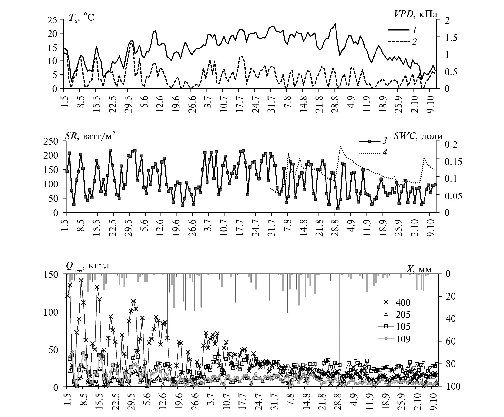 Рис. 2. Суточная динамика температуры воздуха Ta (1), дефицита насыщения водяного пара VPD (2), солнечной радиации SR (3), влажности почвы WSC (4), осадков X, ксилемных расходов Qtree в стволах деревьев 400, 205, 105, 109.