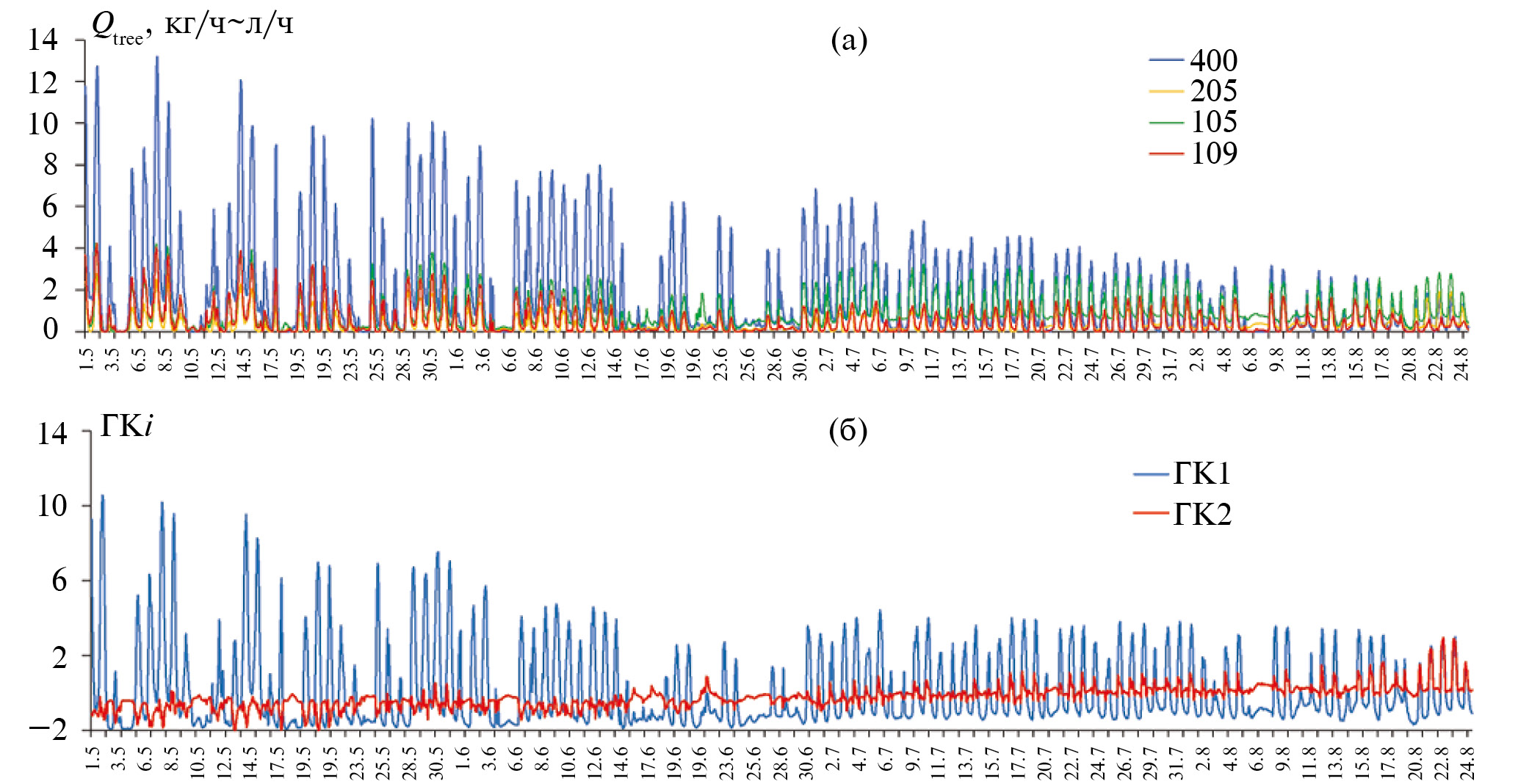 Рис. 3. Пример динамики часового разрешения: а – Qtree, измеренные для деревьев 400, 205, 105, 109; б – ГК1 и ГК2 в МГК-модели I.
