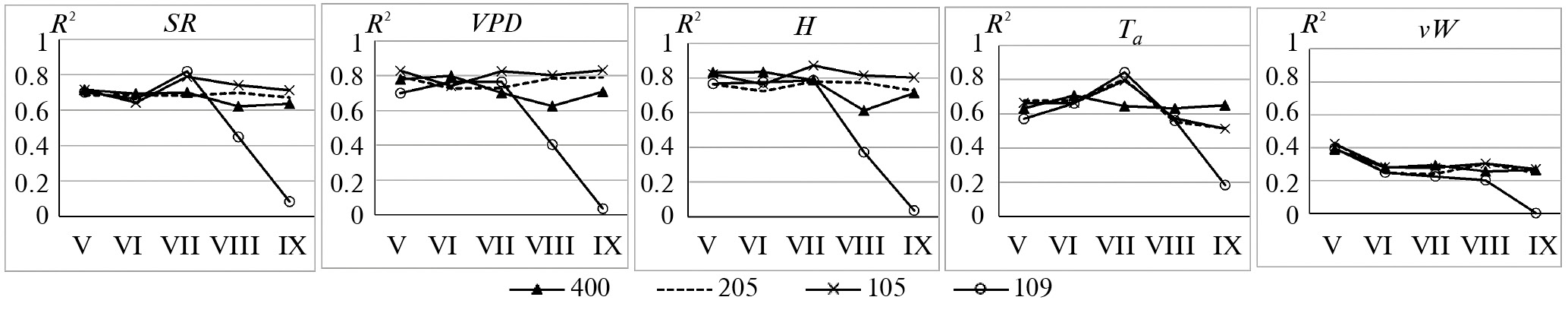 Наиболее тесные корреляционные связи Qtree c VPD, H, SR (0.6 < R2 < 0.85) отмечаются у деревьев 400, 205, 105 на протяжении всего вегетационного сезона (рис. 5). Несколько слабее связь Qtree c Ta (R2 < 0.7), однако в августе у трех деревьев теснота связи растет, при этом R2 достигает 0.80. Для всех деревьев для пары Qtree‒vW R2 связи достигал максимума (0.4) в мае.