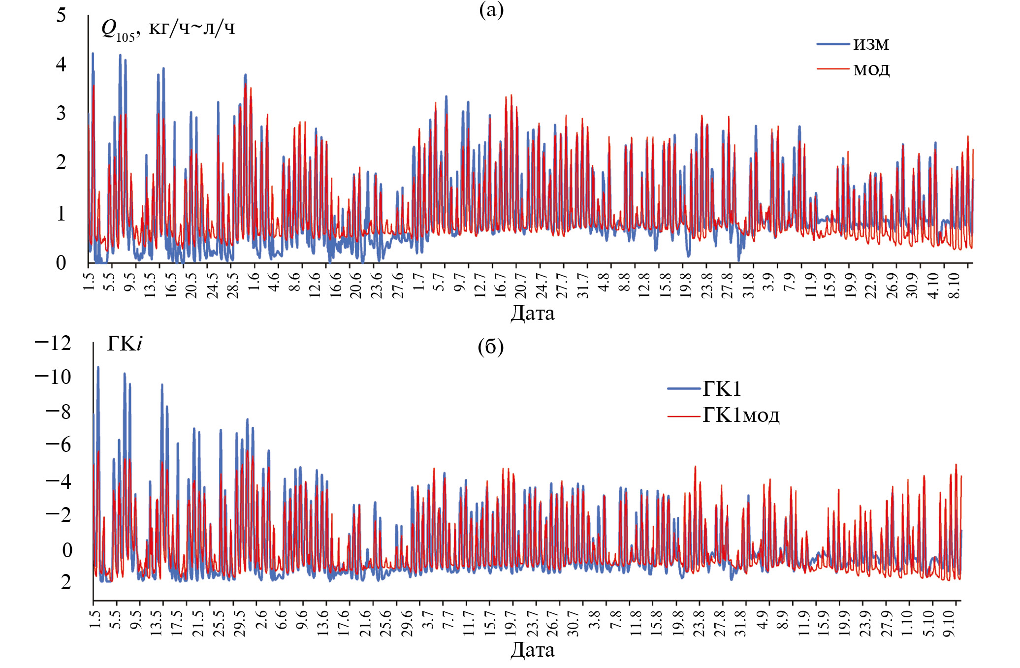 Рис. 6. Часовая динамика ксилемных расходов: а – Q105, б – ГК1 в МГК-модели I; изм – измеренный Q105, мод – рассчитанный по МЛР (предикторы Ta, H, vW, SR, VPD), ГК1мод – рассчитанный по МЛР (предикторы Ta, Н).