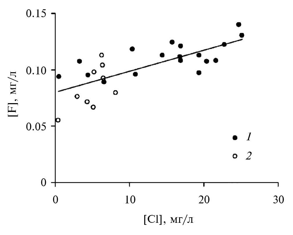 Рис. 2. Зависимость между концентрациями фтора и хлора в водах нижнего течения р. Лены. 1 – спад весенне-летнего половодья 1995 г.; 2 – пик весенне-летнего половодья 2021 г.