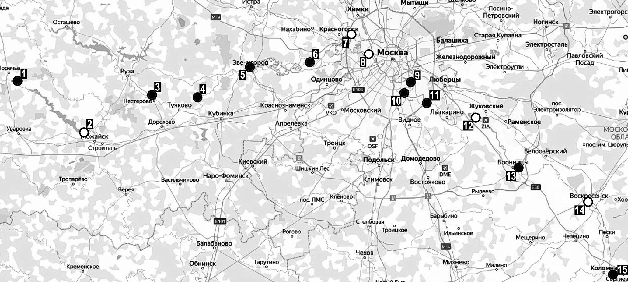 Рис. 1. Картосхема территории расположения точек отбора проб воды в р. Москве (г. Москва и Московская обл.) в 2021 г. Черные кружки – отбор проб на биотестирование и гидрохимический анализ, белые кружки – только гид рохимические исследования.