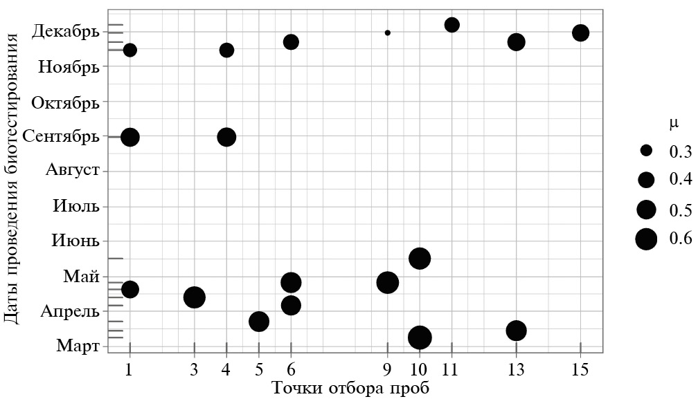 Чувствительность Daphnia magna к стандартному токсиканту в целом оказалась в пределах нормативного диапазона чувствительности для данного тест-объекта – в 16 пробах из 24 значения ЛК50 (24 ч) – 0.9–2.5, в трех пробах >2.5 и в пяти пробах <0.9 мг/дм3. В четырех из них во всем исследованном диапазоне концентраций модельного токсиканта наблюдалась полная гибель рачков и вычислить точное значение ЛК50 было невозможно, однако очевидно, что оно значительно <1 мг/дм3. Эти пробы были отобраны в точках 1 (в апреле и ноябре), 4 (в ноябре) и 6 (в августе).