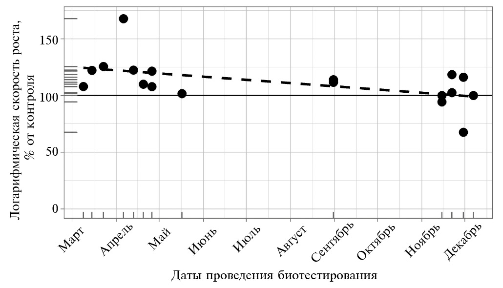 Рис. 3. Cезонная изменчивость относительной скорости роста водорослей в исследованных пробах воды (пунктир – линейная тенденция, горизонтальная линия – уровень контроля).