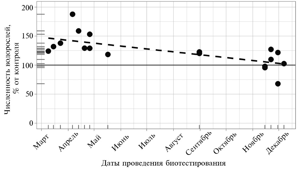 Рис. 4. Численность водорослей, достигнутая за 72 ч, в исследованных пробах воды. Пунктир – линейная тенденция, горизонтальная линия – уровень контроля.