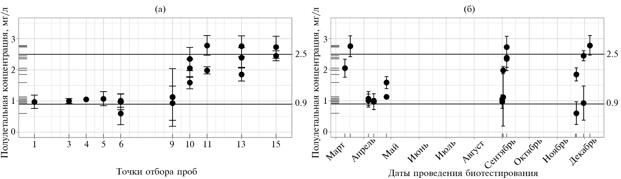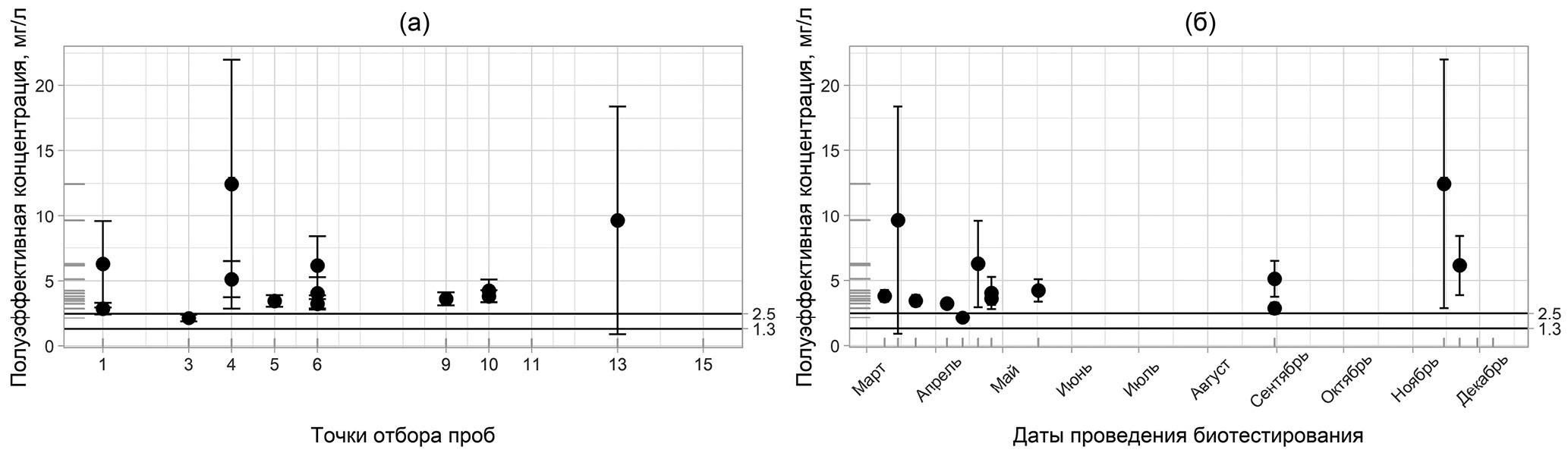 Рис. 5. Пространственная (а) и сезонная (б) изменчивость полулетальной концентрации бихромата калия для Daphnia magna за 24 ч (“усы” – доверительный интервал ЛК50).