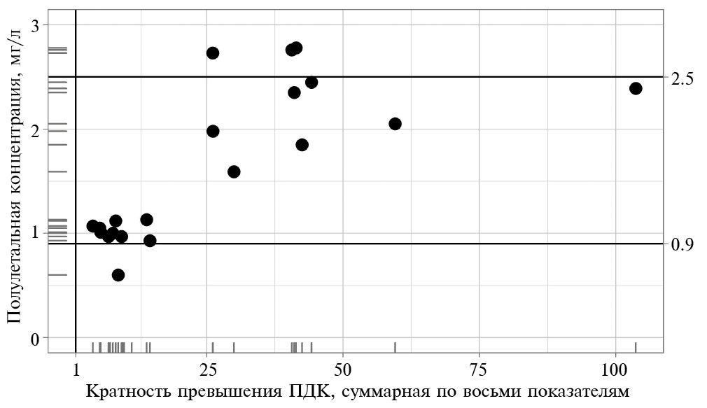 Рис. 8. Соотношение полулетальной концентрации бихромата калия для Daphnia magna за 24 ч с суммарной по восьми показателям кратностью превышения ПДК.