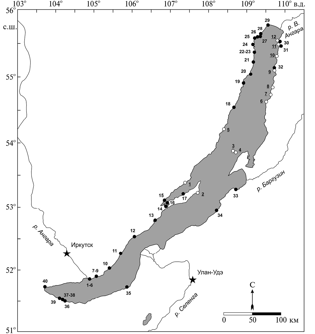 Рис. 1. Картосхема территории отбора проб Spirogyra “morphotype 1” и байкальских бентосных водорослей из литорали оз. Байкал. Черные кружки – станции отбора проб Spirogyra “morphotype 1” и байкальских бентосных водорослей: 1 – зал. Лиственничный, пос. Листвянка, кафе “Аланья”; 2 – пос. Листвянка, 40 м севернее устья р. Сеннушки; 3 – пос. Листвянка, гостиница “Маяк”; 4 – пос. Листвянка, нерпинарий; 5 – пос. Листвянка, кафе “Подкова”; 6 – м. Березовый; 7 – пос. Большие Коты, 300 м севернее устья р. Черной; 8 – пос. Большие Коты, Стационар ЛИН; 9 – пос. Большие Коты, биостанция ИГУ; 10 – пос. Большое Голоустное; 11 – бух. Песчаная; 12 – пос. Бугульдейка (напротив устья р. Бугульдейки); 13 – бух. Ая; 14 – пос. Сахюрта; 15 – р. Сарма; 16 – м. Хорин-Ирги; 17 – пос. Хужир, м. Шаманка; 18 – м. Елохин; 19 – м. Коврижка; 20 – м. Котельниковский; 21 – м. Красный Яр; 22 – с. Байкальское; 23 – м. Лударь; 24 – губа Слюдянская; 25 – бух. Сеногда; 26 – напротив пос. Заречный; 27 – р. Тыя (русло, устье); 28 – г. Северобайкальск; 29 – пос. Нижнеангарск; 30 – бух. Фролиха; 31 – бух. Аяя; 32 – губа Томпуда, гидрометеостанция; 33 – пос. Максимиха; 34 – пос. Турка; 35 – г. Бабушкин; 36 – напротив пруда-отстойника БЦБК; 37 – напротив цеха № 1 БЦБК, глубина 1–3 м; 38 – напротив цеха № 1 БЦБК, глубина 3–7 м; 39 – напротив устья р. Бабхи, гл 4 м; 40 – пос. Култук. Светлые кружки – станции, в литорали которых водоросли рода Spirogyra не обнаружены: 1 – зал. Каргантэ; 2 – мыс Ижимей; 3 – о. Большой Ушканий; 4 – о. Тонкий; 5 – м. Малый Солонцовый; 6 – м. Кабаний; 7 – м. Бирокан; 8 – губа Иринда; 9 – м. Омагачан; 10 – губа Большая Самдаки; 11 – губа Лаканда; 12 – м. Немнянка
