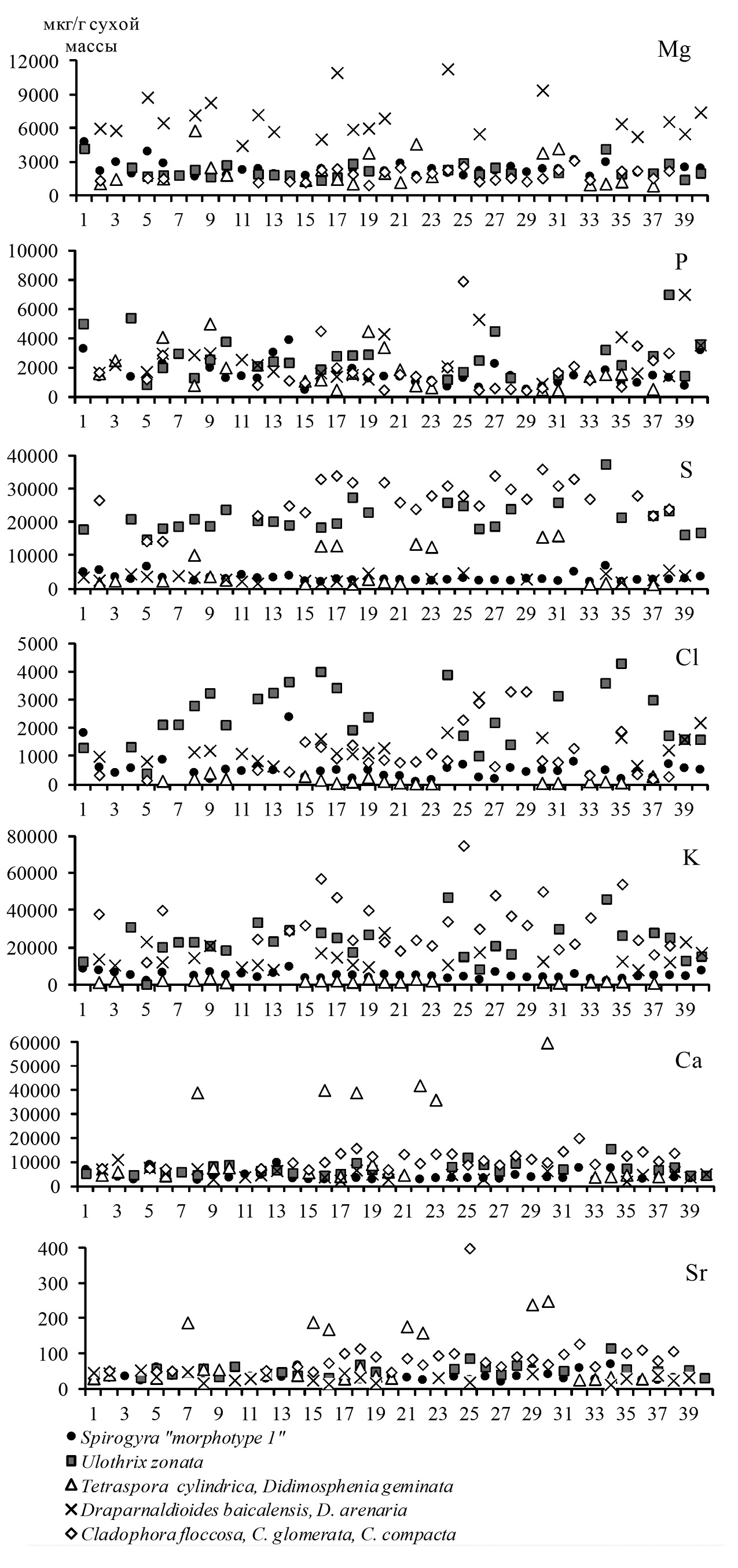 В сухой массе Spirogyra “morphotype 1” на долю Na ~ K ~ Ca ~ S ~ Ba > Mg ≥ P > Mn ≥ Cl приходится 98–99% общего содержания определяемых элементов; 1–2% представлены Fe > Si > Zn> Sr > Al с содержанием в преобладающей части проб 200–30 мкг/г; Br > Ni > As > Cu > Ti > Co > Li, I (0–1.0 мкг/г); Rb > B > Cr > V > Mo > Pb > U > Cd > Y > Se > Sc > Ga (1.0–0.1 мкг/г); Zr > Th > Sb > Nb > W > Hg > Sn > Ge (0.1–0.01 мкг/г); Tl > Ag > Cs > Be > Hf > Bi > Ta (0.005–0.001 мкг/г) (табл. 1).
