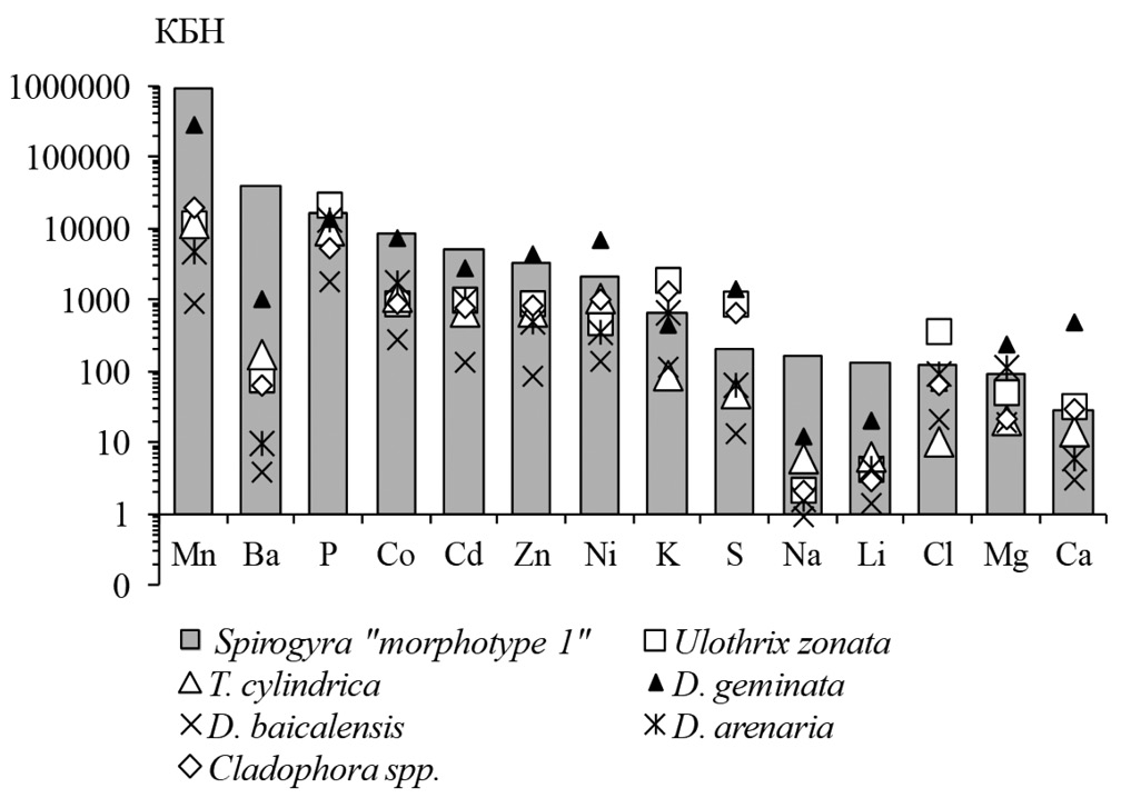 Элементный состав Spirogyra spp. и Spirogyra “morphotype 1” отличается от элементного состава байкальских бентосных водорослей растительных поясов более высоким содержанием Li, Na, Mn, Ba и нехарактерным для пресноводных водорослей соотношением концентраций элементов. В водорослях рода Spirogyra Na > P, Na ≥ K, Na ≥ Ca, Mn > Fe, Ba ~ Ca, Ba ~ S, Ba > Sr. Элементы Mg, P, S, Cl, K, Ca, преобладающие в бентосных водорослях растительных поясов литорали, свободноплавающие виды спирогиры концентрируют так же интенсивно, а Spirogyra “morphotype 1” – в равной (P, Ca, Sr) или в меньшей степени.