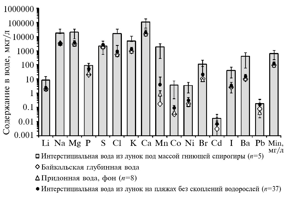 Мощные многолетние скопления разлагающейся спирогиры становятся дополнительным источником потока в мелководную зону растворенных соединений Na, Cl, Mn, Fe, Co, Ni, Ba, содержание которых в незагрязненной воде литорали Байкала постоянно низкое [19]. Отмершие и выброшенные в зону заплеска байкальские бентосные водоросли растительных поясов разлагаются намного быстрее, не образуют многолетних скоплений, обогащают водную среду соединениями Mn, Fe, Co, Ba, Cl, Ni, As в значительно меньшей степени и, в отличие от гниющей спирогиры, не обогащают воду Na, Ca, Mg, Sr, I (табл. 3).