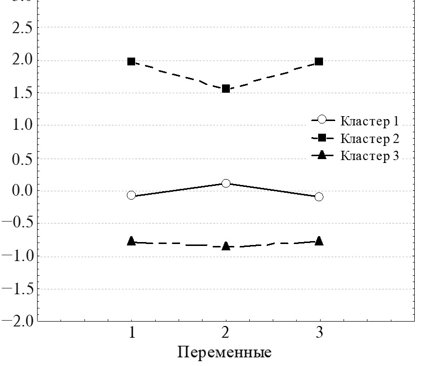 Рис. 8. График координат центров кластеров. Переменные: 1– ∑С в составе спирогиры Na, Mg, P, S, Cl, Ca, Li, Al, Si, Mn, Zn, Ba; 2 – ∑С Na Cl P Mn; 3 – ∑С всех определяемых элементов.