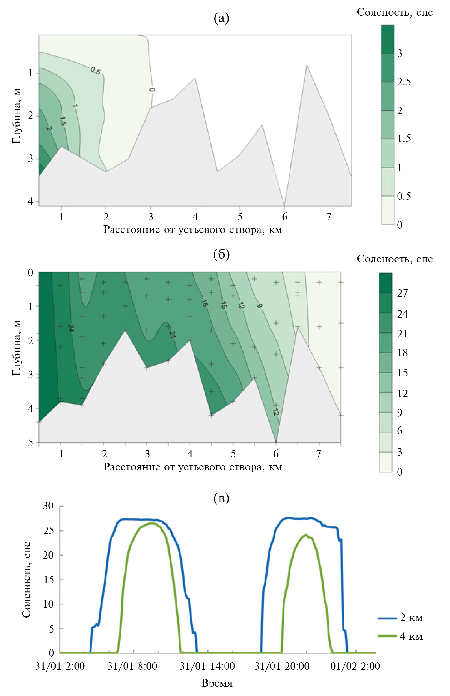 Около устьевого створа осолоненные воды присутствовали постоянно: в отлив соленость здесь снижалась до 2–3 епс, а в прилив она повышалась до 28 епс (рис. 3). В средней части эстуария (в 4 км от устьевого створа) они фиксировались на протяжении 4–5 ч каждого приливного цикла (~12.5 ч).