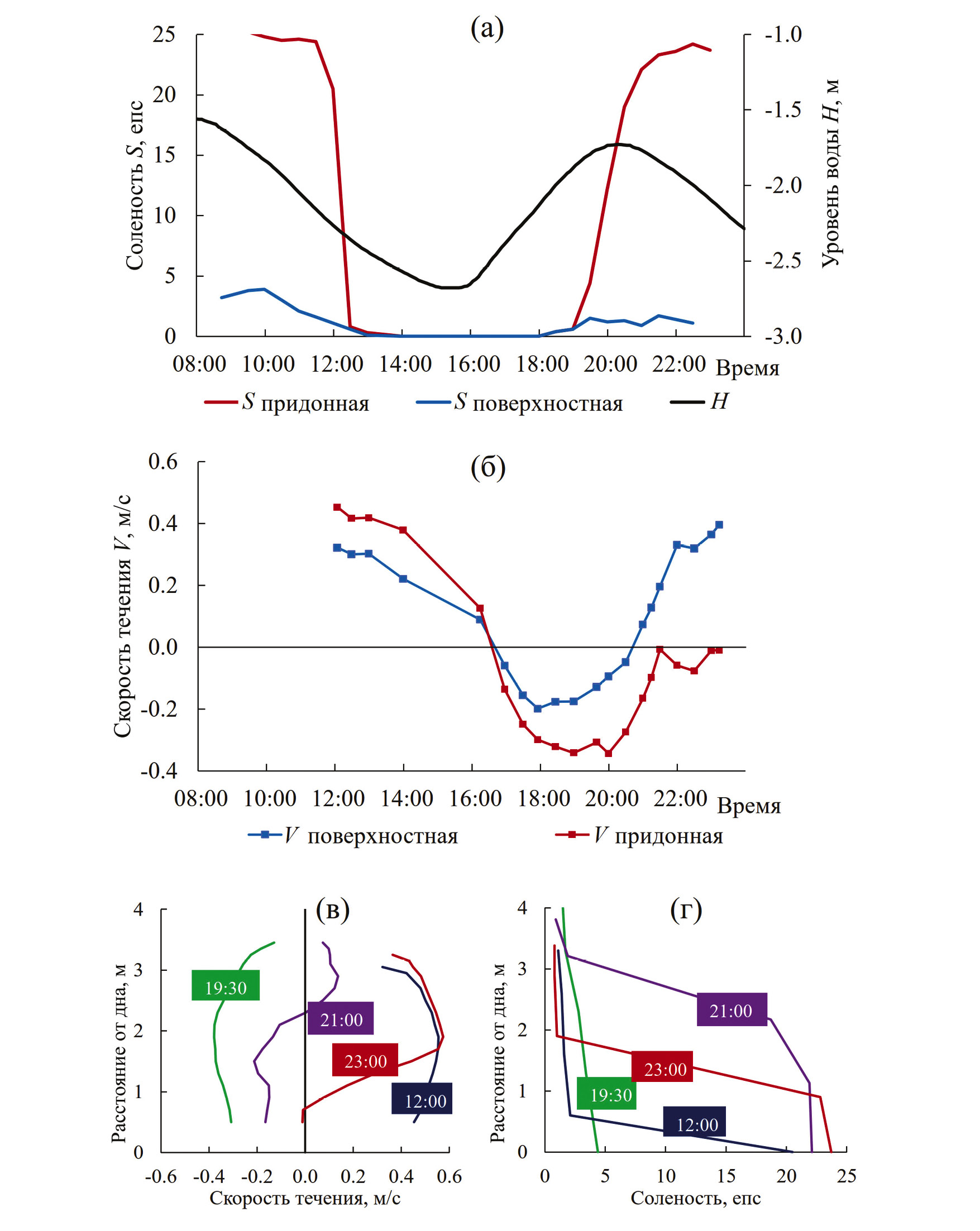 Сразу после наступления ПВ (в ~20:30) течение в поверхностном слое повернуло к морю (рис. 4). При этом у дна оно еще ~2 ч оставалось обратным, хотя и постепенно ослабевало. В это время соленость воды у поверхности уменьшалась, а у дна продолжала нарастать. Максимум придонной солености (24.2 епс) был измерен в 22:30, т. е. спустя 1.5 ч после ПВ. Затем течение у дна повернуло на отлив и началось постепенное отступание осолоненной воды. По-видимому, это пример эстуарной циркуляции, суть которой заключается в одновременном существовании стока пресных вод на поверхности и притока осолоненных вод у дна. Движение воды в поверхностном слое поддерживается градиентами уровня, направленными в сторону моря, а в придонном слое – градиентами солености, направленными в обратную сторону.