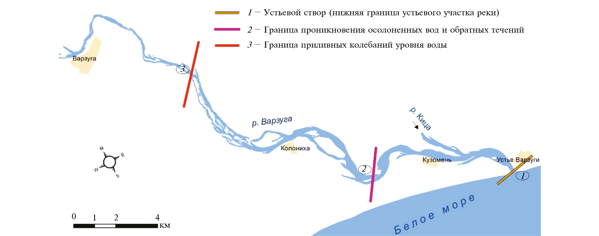 Исследования, проведенные в устье р. Варзуги зимой 2020 г., показали следующее. Для нижнего течения реки характерно сильное влияние морских приливов, которое выражается в соответствующих колебаниях уровня, а также в периодическом возникновении обратных (приливных) течений и интрузии осолоненных вод. Наибольшая дальность распространения приливов и осолонения в реку составила 20 и 7.5 км соответственно.