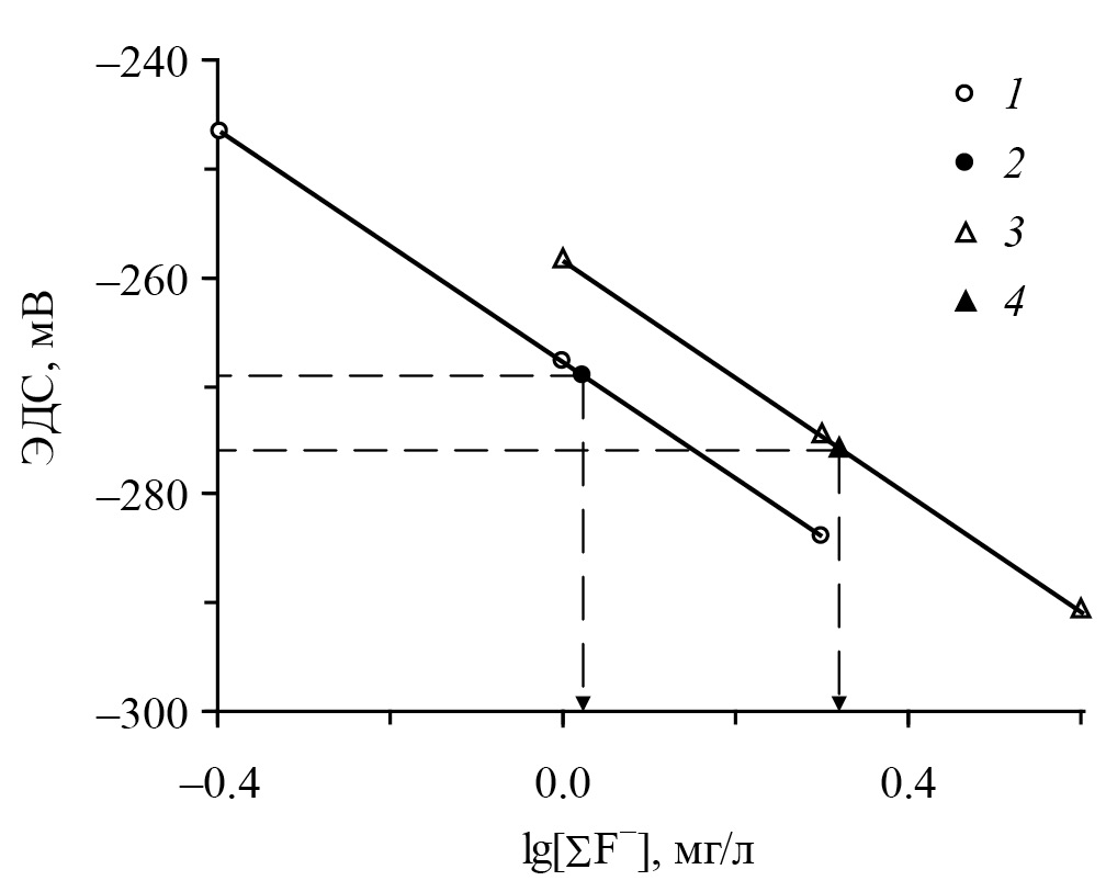 Рис. 1. Определение содержания фтора в пробах воды Мертвого моря и оз. Урмия методом прямой потенциометрии при разбавлении 1 : 5. Мертвое море: 1 – калибровочные растворы на искусственном аналоге, 2 – природная вода; оз. Урмия: 3 – калибровочные растворы на искусственном аналоге, 4 – природная вода.