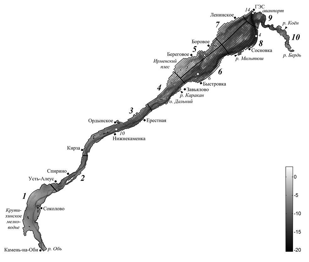 Уровень дна в ячейке получался как среднее арифметическое попадающих в нее отметок уровня согласно цифровой модели рельефа ложа водохранилища (ЦМР), построенной в ИВЭП СО РАН. Основой для построения ЦМР была карта водного пути, уточненная и дополненная данными промерных работ, проведенных экспедиционными отрядами ИВЭП СО РАН в 2008–2010 гг. [8, 13] (рис. 1).