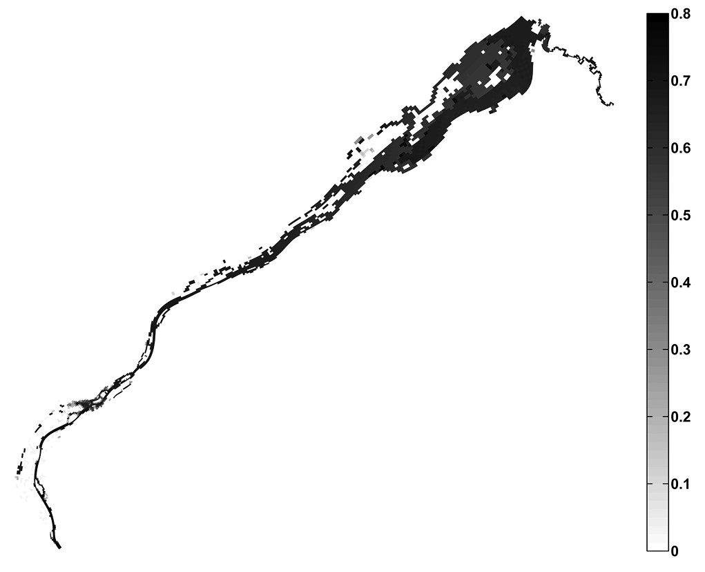 В целом толщина льда в данном расчете была занижена особенно в озерной части водохранилища, что может быть частично объяснено локальными особенностями мест измерений, не передаваемыми в масштабе модели, и использованием усредненных по пространству начальных данных и метеоданных, в том числе интенсивности осадков.