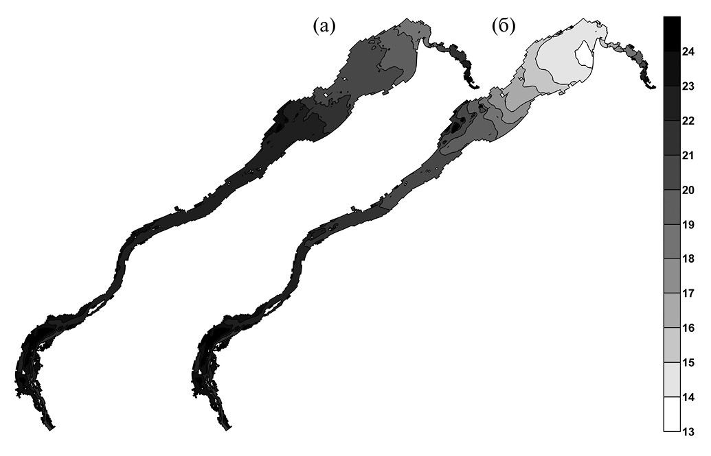 Рис. 3. Поверхностная (а) и придонная (б) расчетная температура воды Новосибирского водохранилища в полдень 14 июня 1981 г. (°C)