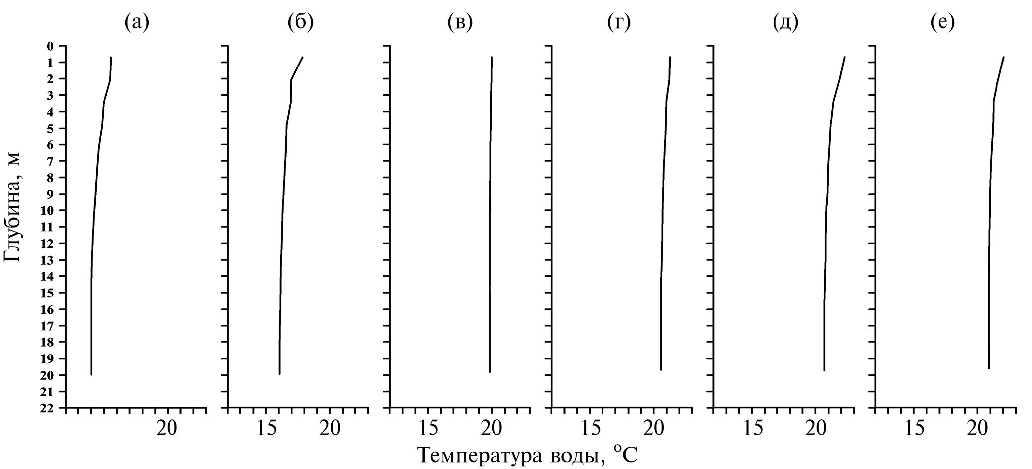 Рис. 4. Вертикальное распределение расчетной (сплошная линия) и измеренной (точки) температуры воды на рейдовой вертикали № 14 (у плотины ГЭС) Новосибирского водохранилища для моментов наибольшей стратификации по данным измерений. а – 10 июня, б – 19 июня, в – 1 июля, г – 20 июля, д – 10 августа, е – 20 августа