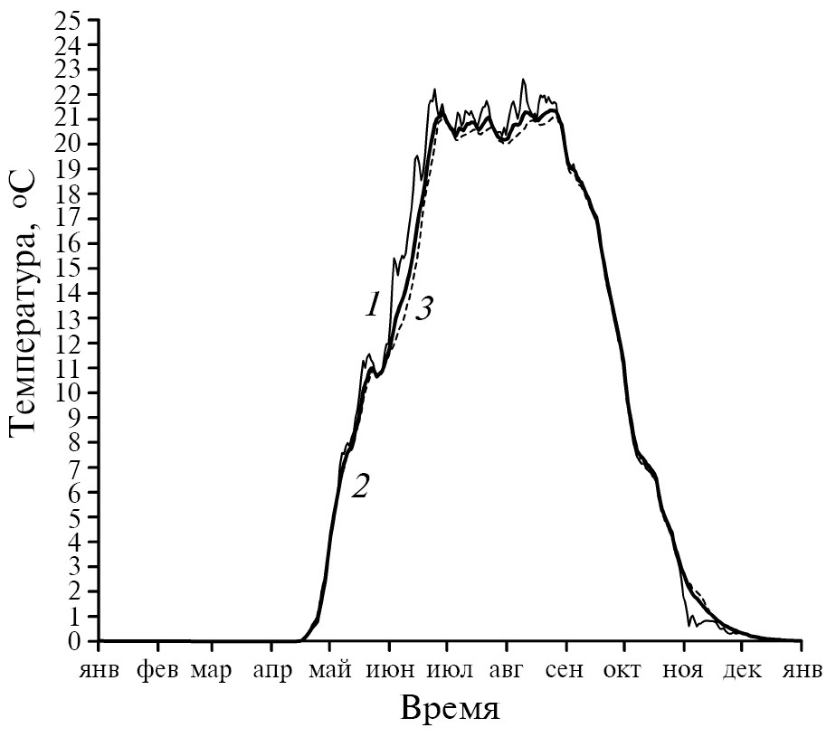 На рис. 5 даны графики годового хода расчетной среднесуточной температуры воды для поверхностных боксов некоторых районов водохранилища (рис. 1). Все графики ведут себя в соответствии с описанием, данным в предыдущем разделе.