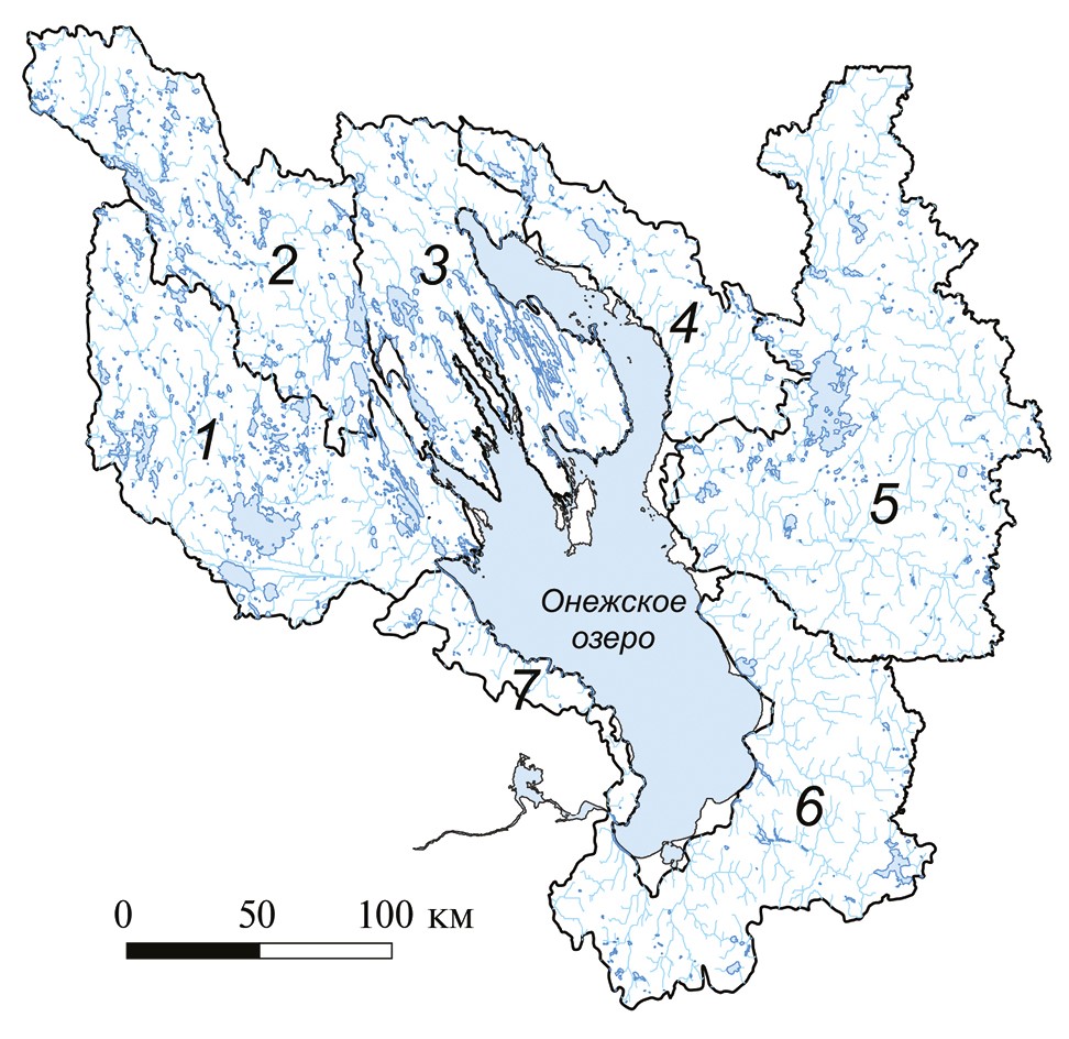 Рис. 1. Гидрографическая структура бассейна Онежского озера: водосборы рек Шуи (1) и Суны (2), Заонежье (3), водосборы восточных притоков (4), р. Водлы (5), южных (6) и западных (7) притоков