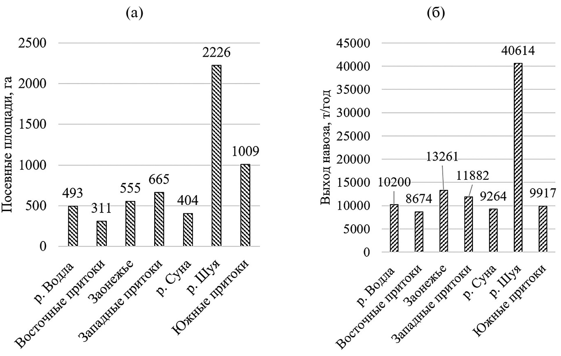 Рис. 2. Посевные площади (а) и выход навоза в животноводстве (б) изучаемых подбассейнов