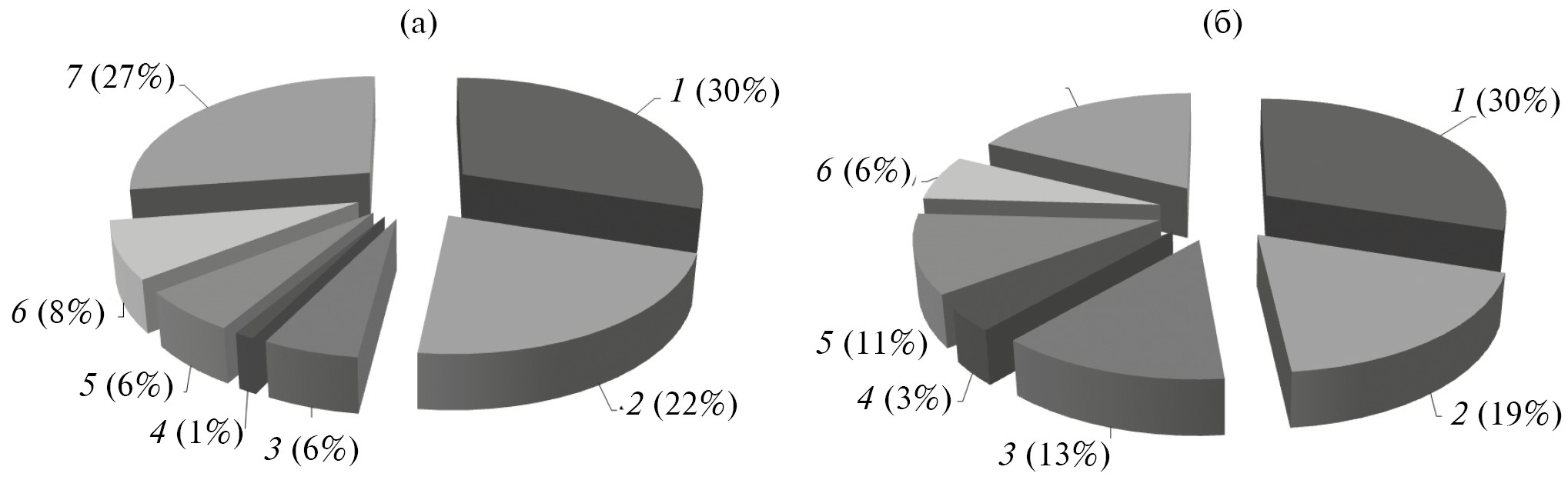 Рис. 3. Долевой вклад выноса фосфора (а) и азота (б) с изучаемых подбассейнов в суммарную нагрузку на Онежское озеро в 2021 г. (год средней водности): 1 – р. Водла, 2 – р. Шуя, 3 – р. Суна, 4 – западные притоки, 5 – Заонежье, 6 – восточные притоки, 7 – южные притоки