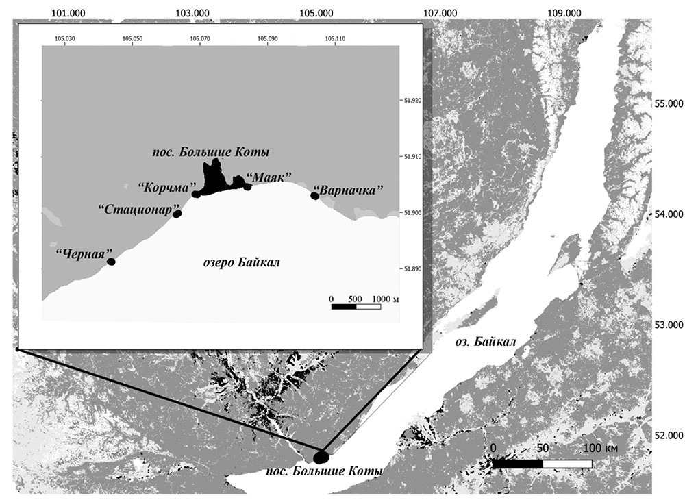 Работ по изучению санитарно-показательных микроорганизмов в районе пос. Б. Коты немного. Необходимо отметить работу [2], в большой части касающуюся интерстициальных вод, изучаемых в пределах пляжей бух. Большие Коты. В работе [59] исследователи отмечают значительные превышения нормативов по санитарно-показательным микроорганизмам, которые обнаружены в июле 2022 г. в районе пос. Б. Коты. Концентрация E. coli была превышена в 9, энтерококков – в 35 раз [59]. В работе подобного плана [9] пробы воды отбирались по всему периметру озера в течение нескольких лет (с 2012 по 2016 г. и в 2020 г.). По статистическим расчетам динамики показателей качества воды по данным мониторинговых станций в поселках Листвянка и Большие Коты в большинстве случаев не выявили существенных различий численности фекальных индикаторных бактерий (ФИБ) в разные месяцы исследования [9]. На фоне экологического кризиса [17, 43, 61], который, как принято считать, начался с 2010–2011 гг. в масштабах прибрежной зоны всего озера, подобные работы необходимы для выяснения причин его возникновения.