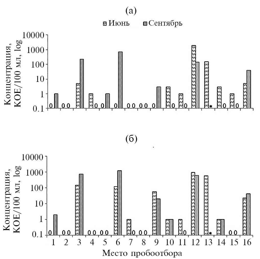 Рис. 2. Концентрации E. coli (а) и энтерококков (б) в приурезовой, придонной и интерстициальной воде в районе пос. Б. Коты в 2022 г. 1 – Стационар, 1 м от уреза; 2 – Стационар, у дна; 3 – Стационар, лунка; 4 – Корчма, 1 м от уреза; 5 – Корчма, у дна; 6 – Корчма, лунка; 7 – Варначка, 1 м от уреза; 8 – Варначка, у дна; 9 – Варначка, лунка; 10 – Маяк, 1 м от уреза; 11 – Маяк, у дна; 12 – Маяк, лунка; 13 – Черная, 1 м от уреза, после ливня; 14 – Черная, 1 м от уреза; 15 – Черная, у дна; 16 – Черная, лунка. Звездочки на местах столбцов в диаграмме свидетельствуют об отсутствии данных. Нули на местах столбцов в диаграмме свидетельствуют о том, что при анализе проб ФИБ не были обнаружены
