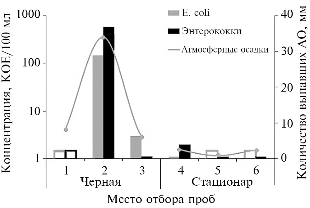 В июне проведена рекогносцировка распределения ФИБ в приурезовой зоне (в 300 м севернее пади Черной) в условиях сильного ливня и на следующий день после него (рис. 3). Грязные ручьи стекали со склона, у подножия которого были отобраны пробы прибрежной воды. Выяснено, что во время этого события (11 июня) концентрации E. coli и энтерококков в приурезовой воде составили 148 и 580 КОЕ/100 мл соответственно, что нетипично много для данной точки, в которой ранее отмечались незначительные показатели численности ФИБ, о чем указывалось в [2], где средние величины по термотолерантным колиформным бактериям (в которые входит E. coli) и энтерококкам с 2011 по 2013 г. составляли 2 и 6 КОЕ/100 мл соответственно. На следующий день (12 июня) концентрации E. coli и энтерококков в приурезовой воде составили в среднем 3 и 1 КОЕ/100 мл (рис. 2, 3). Измеренное количество выпавших осадков с 10 на 11 июня составило 34 мм, в последующие два дня (12–13 июня) – 6.4 мм, в предыдущие четыре дня перед ливнем (с 6 по 9 июня) – 8.1 мм. Количество осадков в июне основано на данных по близлежащему пос. Листвянка. В сентябре такого количества выпавших осадков не отмечалось, тем не менее в ходе осеннего отбора проб для определения влияния АО на численность ФИБ вода отбиралась с периодичностью через день (табл. 1, 2). В табл. 2 приведены данные о количестве выпавших АО. Параллельно в точке “Стационар” определялись концентрации ФИБ в приурезовой зоне озера. После дождя 14 сентября в воде были обнаружены 1 КОЕ/100 мл E. coli и 2 КОЕ/100 мл энтерококков. В пробах, отобранных 22 сентября (20–21 сентября небольшой дождь), концентрации E. coli и энтерококков составляли 0 и 1 КОЕ/100 мл соответственно. Такие же значения наблюдали и на следующий день после осадков, выпавших 24 сентября.