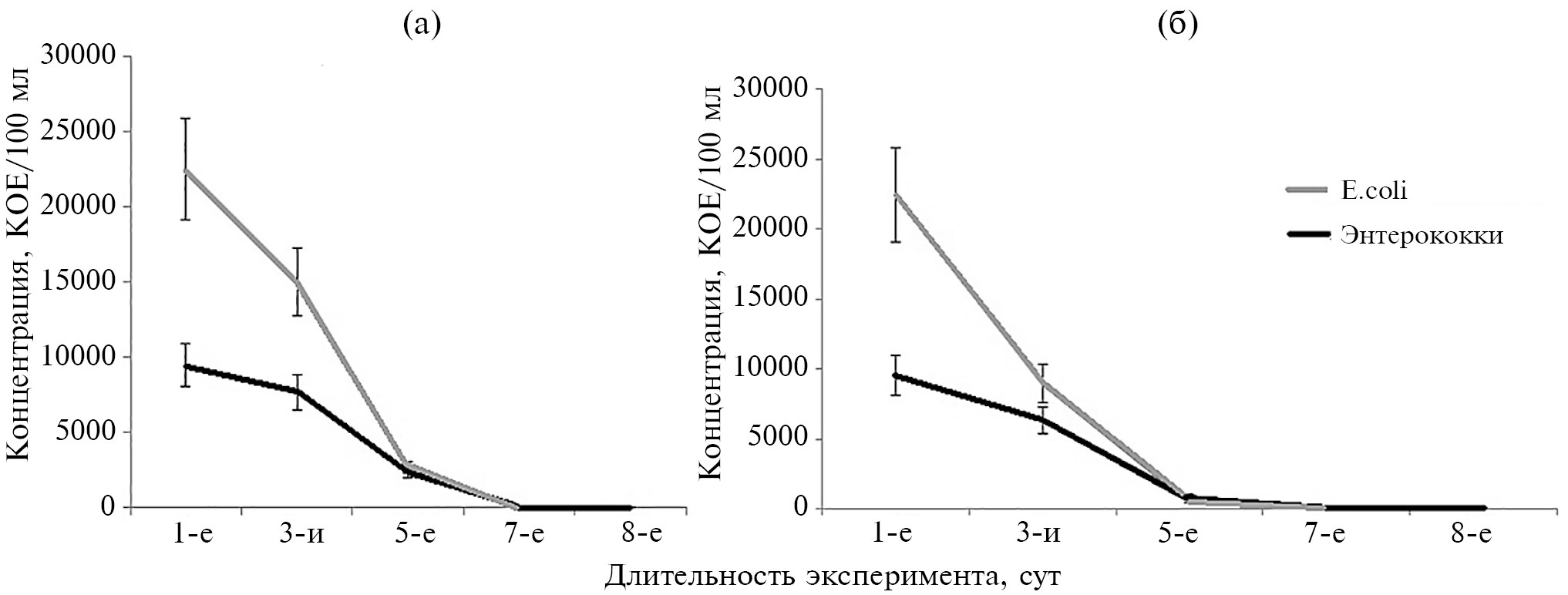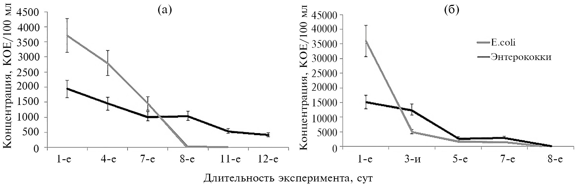 В настоящем исследовании показано, что на 12-е сут культивирования концентрация энтерококков составила 415 КОЕ/100 мл, что составило >21% исходной концентрации клеток (1940 КОЕ/100 мл) (рис. 5а) в случае мезокосма, сообщающегося с окружающей средой и расположенного в лунке, выкопанной в приурезовой зоне. Одновременно видно, что в мезокосмах, расположенных в прибрежной воде и подвергающихся регулярному влиянию дневного света, численность энтерококков была близка к нулю уже на 7-е сут (рис. 4а, 4б). Другие исследователи [45] провели довольно интересную работу в микрокосмах по энтерококкам в лабораторных стрессовых условиях, схожих с условиями в оз. Гарда (Италия). При температуре 4°С в микрокосме с непрерывным освещением никаких культивируемых клеток не наблюдалось после 20 сут инкубации для E. faecalis и после 45 сут в случае с E. faecium. Более заметная задержка, а именно 40 сут, наблюдалась, когда в микрокосме со стерилизованной озерной водой, содержащей E. faecalis, клетки поддерживались при 4°С в месте, которое не было непрерывно освещаемо, что свидетельствовало о том, что именно непрерывное освещение оказывало губительное действие на клетки энтерококков. При этом последнем условии на 70-е сут от времени инокуляции микрокосма 103/мл клеток E. faecium все еще оставались культивируемыми [45]. Таким образом, время сохранения культивируемого состояния микроорганизмов может увеличиваться в отсутствие постоянного освещения, что согласуется с итогами настоящего исследования (рис. 4а, 4б, 5а). Такая большая разница времени сохранения культивируемого состояния клеток ФИБ в настоящем и упомянутом выше исследовании может быть связана с тем, что в опытах [45] использовалась стерильная проавтоклавированная вода без комплекса автохтонной микрофлоры (простейших, зоопланктона, бактерий), тогда как в данном исследовании использовалась неавтоклавированная природная вода со всем комплексом микроорганизмов, которые потенциально могут уменьшить численность энтерококков и E. coli, что подтверждено предыдущим исследованием [66].