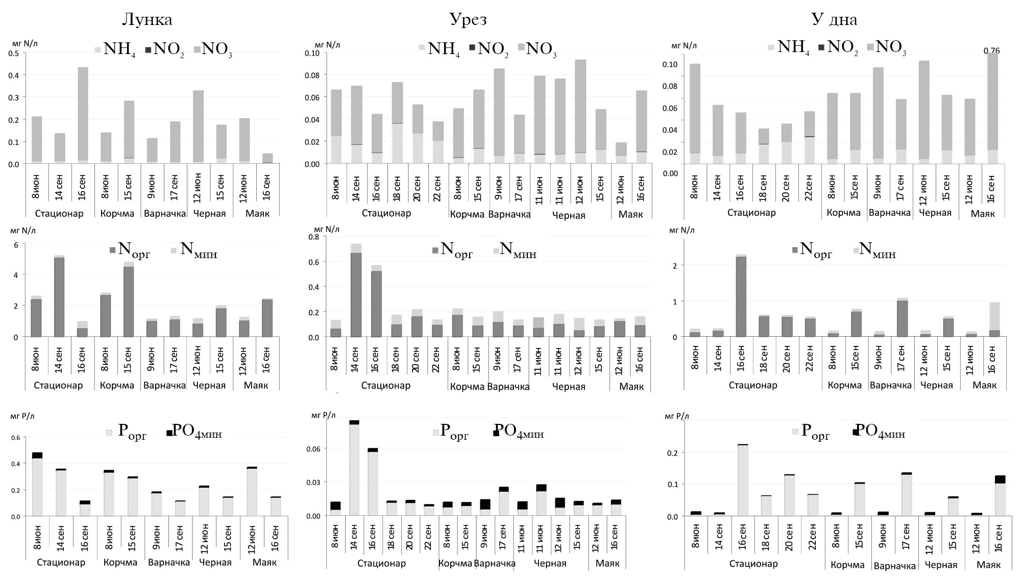 Отмечено, что концентрации фосфатов в июне на четырех трансектах из пяти превышали их концентрации в сентябре. Исключение составила трансекта у гостиницы “Маяк”. В интерстициальной воде в этой точке концентрации фосфатов были выше в июне, тогда как в пробах урезовой и придонной воды в сентябре они превышали июньские соответственно в 2.6 и 3.9 раза. Это может быть связано с периодичностью функционирования данной гостиницы, количеством ее посетителей в августе и сентябре и герметичностью используемого септика. Места отбора проб воды, особенно придонной, вполне могут соответствовать местам субаквальной разгрузки подземных вод, загрязненных стоками от объектов туристической инфраструктуры [16]. Высокое содержание минерального фосфора в интерстициальных водах, например в лунке в пади Жилище в июне (0.043 мг/л), характерно в основном для районов, испытывающих заметную антропогенную нагрузку [18].