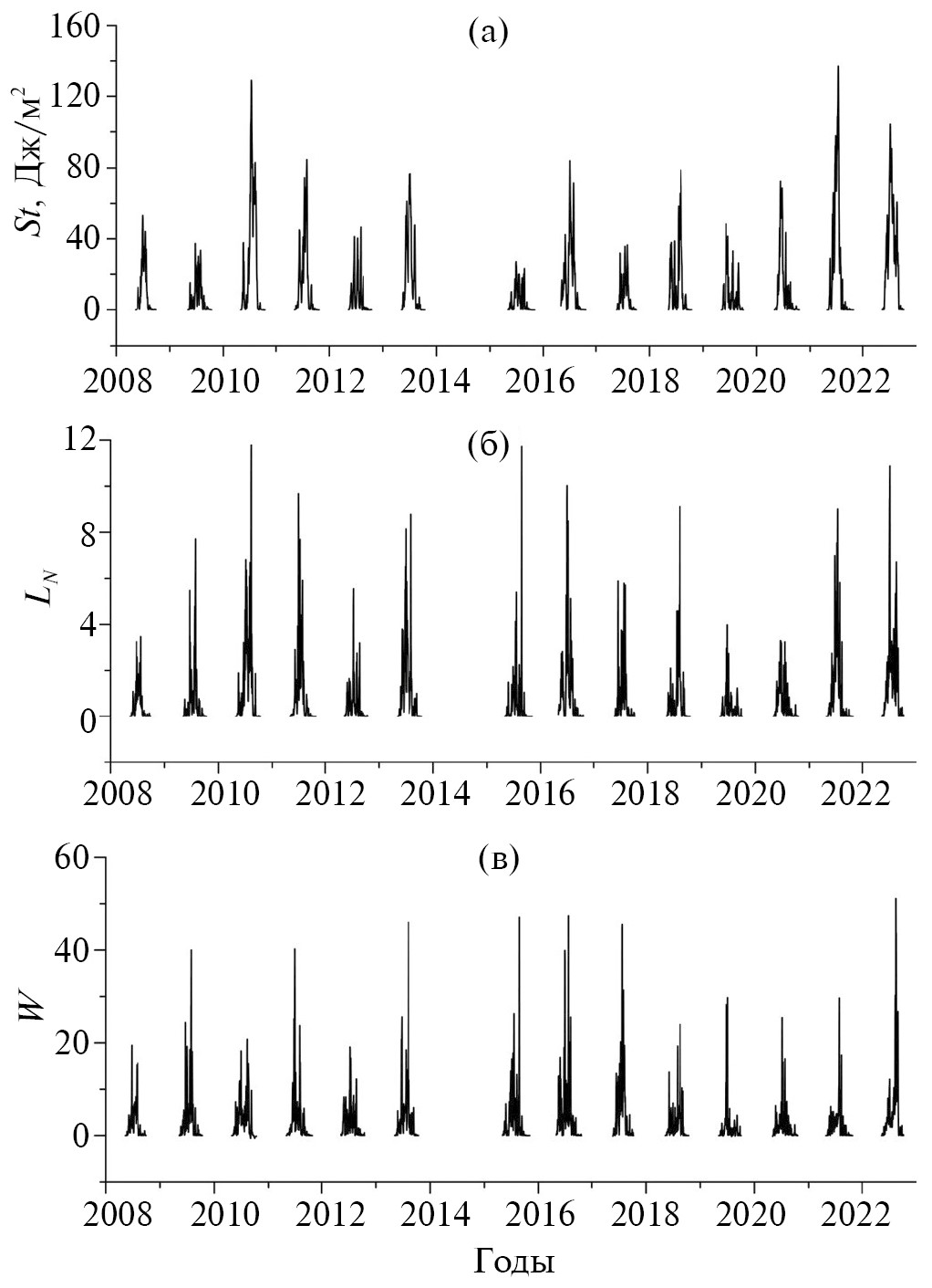 Число Веддерберна W в некоторые дни в годы исследований достигало 20–40 (рис. 2в). Максимальные значения W в отдельные дни жарких летних месяцев были >50.