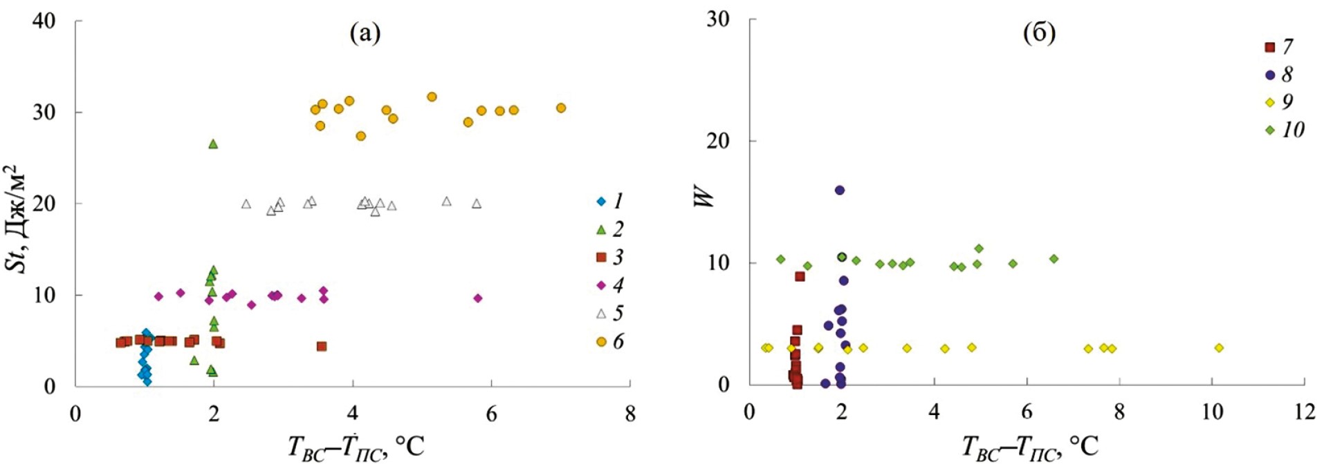 Рис. 3. Соответствие между значениями St (а) и W (б) и разницей температуры воды между верхним (ТВС) и придонным (ТПС) слоями водной толщи за все годы измерений с мая по октябрь. 1 и 7 – значения St и W, соответствующие разнице температуры по водному столбу ~1°С; 2 и 8 – значения St и W, соответствующие разнице температуры по водному столбу ~2°С; 3–6 – разница температуры, соответствующая характерным значениям St ~5, ~10, ~20 и ~30 Дж/м2 соответственно; 9 и 10 – разница температуры, соответствующая характерным значениям W ~3 и W ~10 соответственно