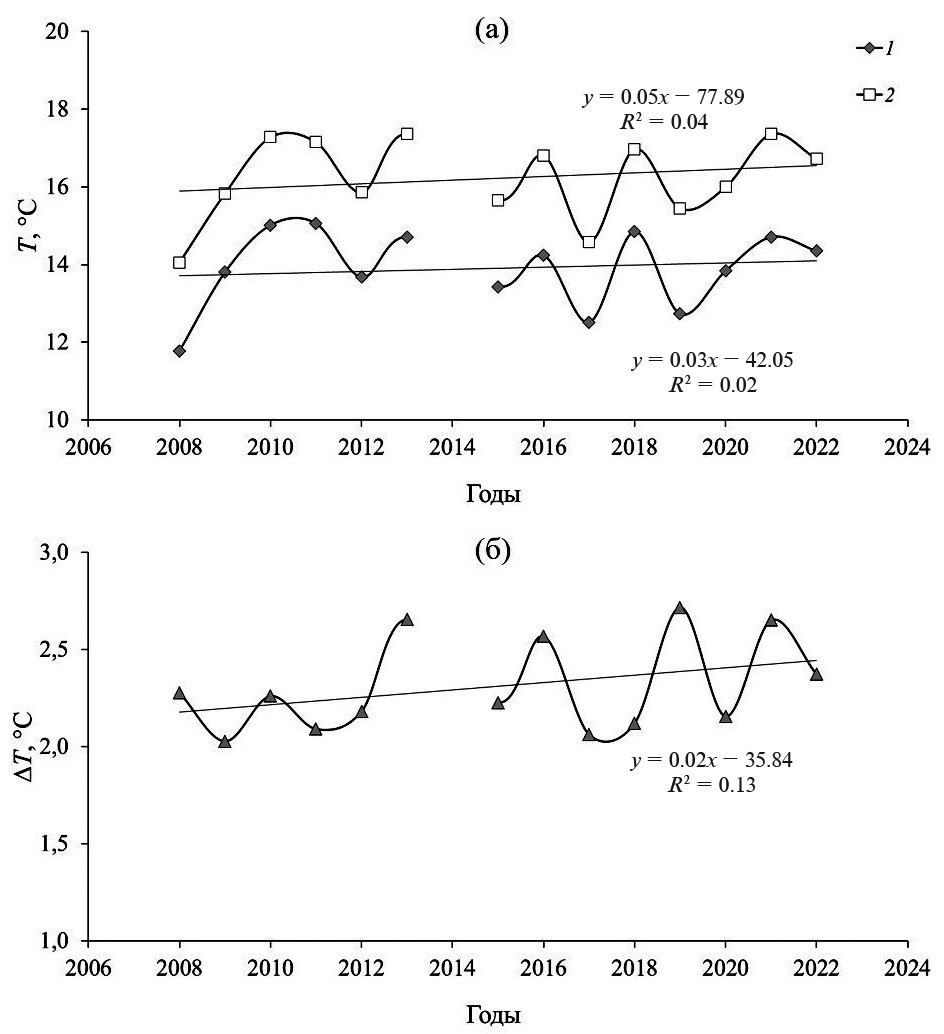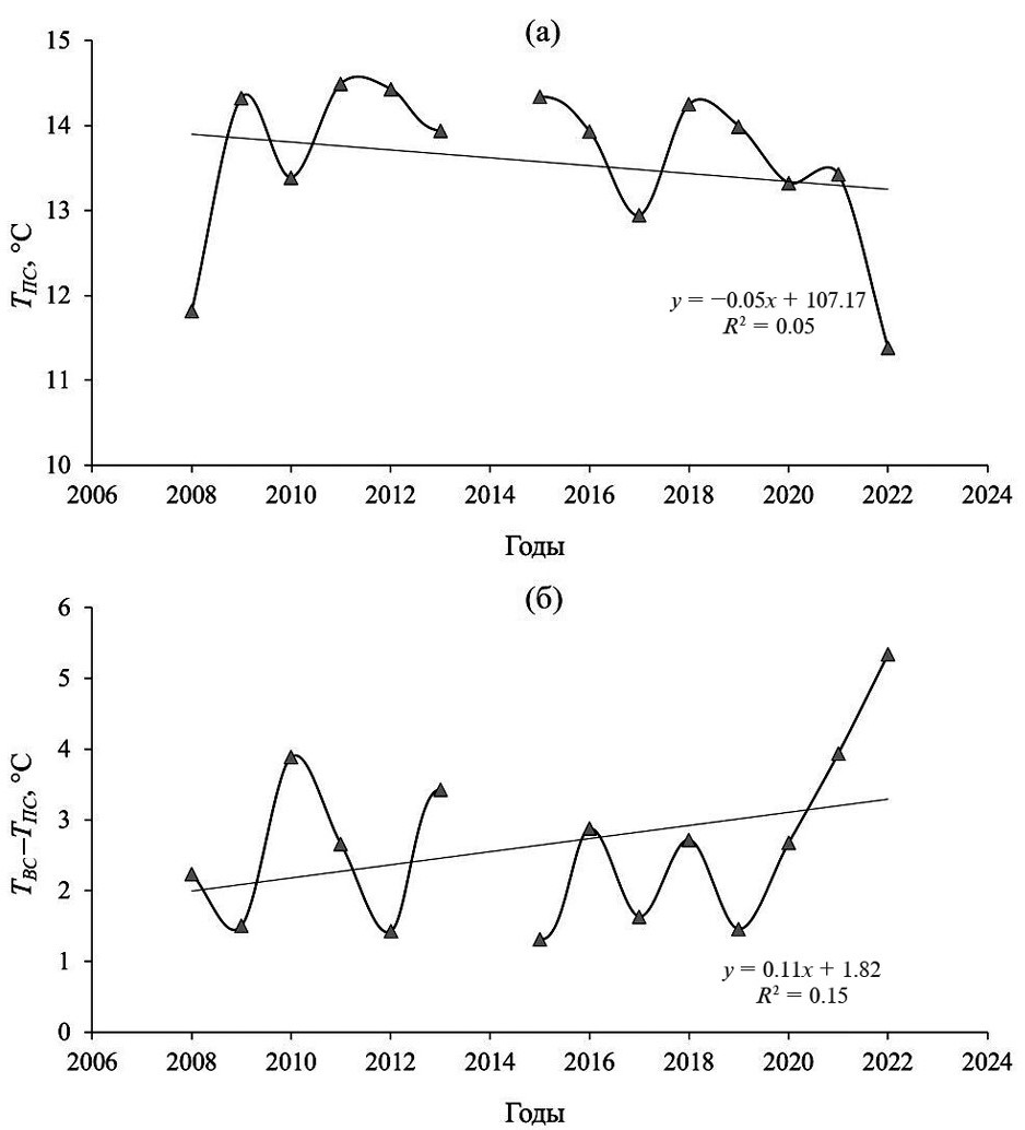 Линейные тренды осредненных за период с 20 мая по 30 сентября для каждого отдельного года значений температуры верхнего слоя воды оз. Вендюрского и температуры воздуха по данным реанализа с 2008 по 2022 г. отражали положительные изменения, но были незначимыми (рис. 5а). Линейный тренд температуры воды придонного слоя за те же годы отражал отрицательные изменения, но также был незначимым (рис. 6а). Разница температуры воды верхнего слоя озера и температуры воздуха (∆T) слабо увеличивалась (рис. 5б), разница температуры воды верхнего и придонного слоев озера (ТВС–ТПС) также увеличивалась (рис. 6б), но статистически значимых трендов не было обнаружено.